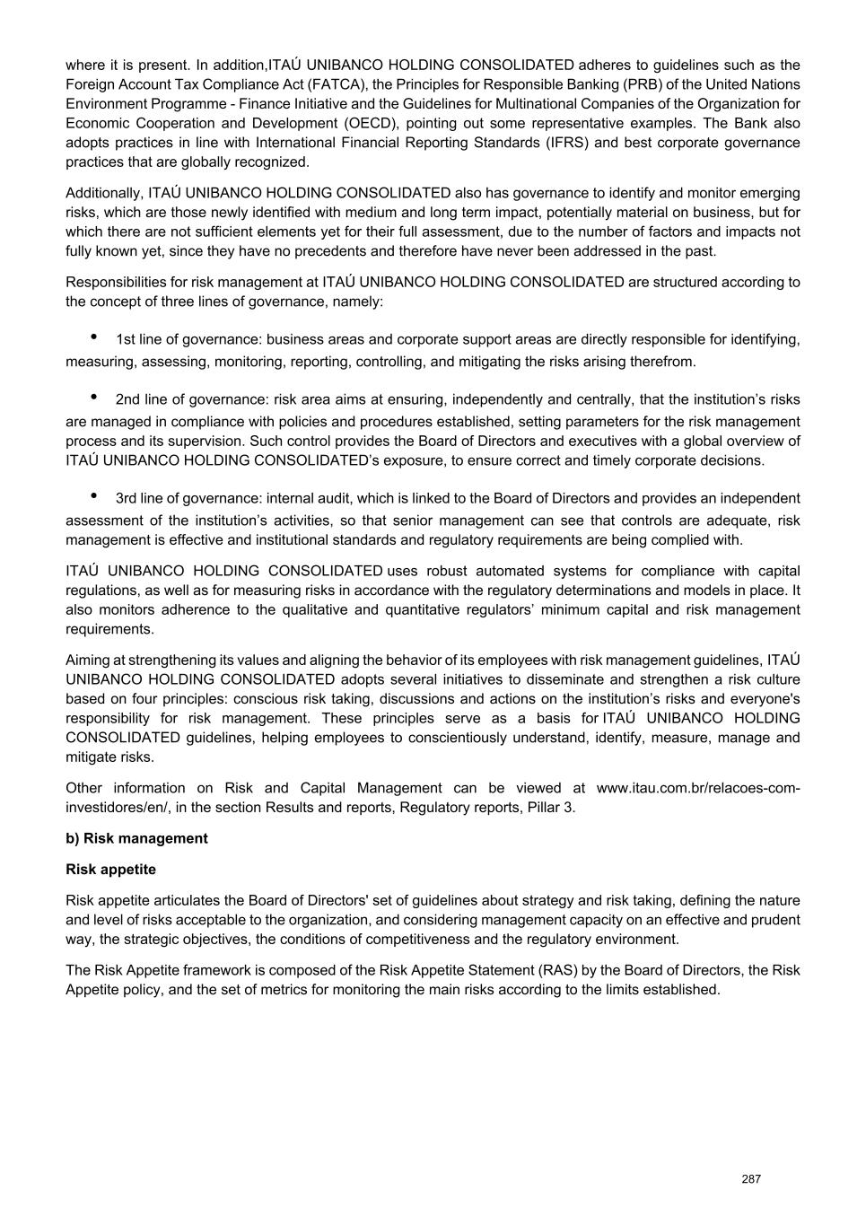 where it is present. In addition,ITAÚ UNIBANCO HOLDING CONSOLIDATED adheres to guidelines such as the Foreign Account Tax Compliance Act (FATCA), the Principles for Responsible Banking (PRB) of the United Nations Environment Programme - Finance Initiative and the Guidelines for Multinational Companies of the Organization for Economic Cooperation and Development (OECD), pointing out some representative examples. The Bank also adopts practices in line with International Financial Reporting Standards (IFRS) and best corporate governance practices that are globally recognized. Additionally, ITAÚ UNIBANCO HOLDING CONSOLIDATED also has governance to identify and monitor emerging risks, which are those newly identified with medium and long term impact, potentially material on business, but for which there are not sufficient elements yet for their full assessment, due to the number of factors and impacts not fully known yet, since they have no precedents and therefore have never been addressed in the past. Responsibilities for risk management at ITAÚ UNIBANCO HOLDING CONSOLIDATED are structured according to the concept of three lines of governance, namely: • 1st line of governance: business areas and corporate support areas are directly responsible for identifying, measuring, assessing, monitoring, reporting, controlling, and mitigating the risks arising therefrom. • 2nd line of governance: risk area aims at ensuring, independently and centrally, that the institution’s risks are managed in compliance with policies and procedures established, setting parameters for the risk management process and its supervision. Such control provides the Board of Directors and executives with a global overview of ITAÚ UNIBANCO HOLDING CONSOLIDATED’s exposure, to ensure correct and timely corporate decisions. • 3rd line of governance: internal audit, which is linked to the Board of Directors and provides an independent assessment of the institution’s activities, so that senior management can see that controls are adequate, risk management is effective and institutional standards and regulatory requirements are being complied with. ITAÚ UNIBANCO HOLDING CONSOLIDATED uses robust automated systems for compliance with capital regulations, as well as for measuring risks in accordance with the regulatory determinations and models in place. It also monitors adherence to the qualitative and quantitative regulators’ minimum capital and risk management requirements. Aiming at strengthening its values and aligning the behavior of its employees with risk management guidelines, ITAÚ UNIBANCO HOLDING CONSOLIDATED adopts several initiatives to disseminate and strengthen a risk culture based on four principles: conscious risk taking, discussions and actions on the institution’s risks and everyone's responsibility for risk management. These principles serve as a basis for ITAÚ UNIBANCO HOLDING CONSOLIDATED guidelines, helping employees to conscientiously understand, identify, measure, manage and mitigate risks. Other information on Risk and Capital Management can be viewed at www.itau.com.br/relacoes-com- investidores/en/, in the section Results and reports, Regulatory reports, Pillar 3. b) Risk management Risk appetite Risk appetite articulates the Board of Directors' set of guidelines about strategy and risk taking, defining the nature and level of risks acceptable to the organization, and considering management capacity on an effective and prudent way, the strategic objectives, the conditions of competitiveness and the regulatory environment. The Risk Appetite framework is composed of the Risk Appetite Statement (RAS) by the Board of Directors, the Risk Appetite policy, and the set of metrics for monitoring the main risks according to the limits established. 287