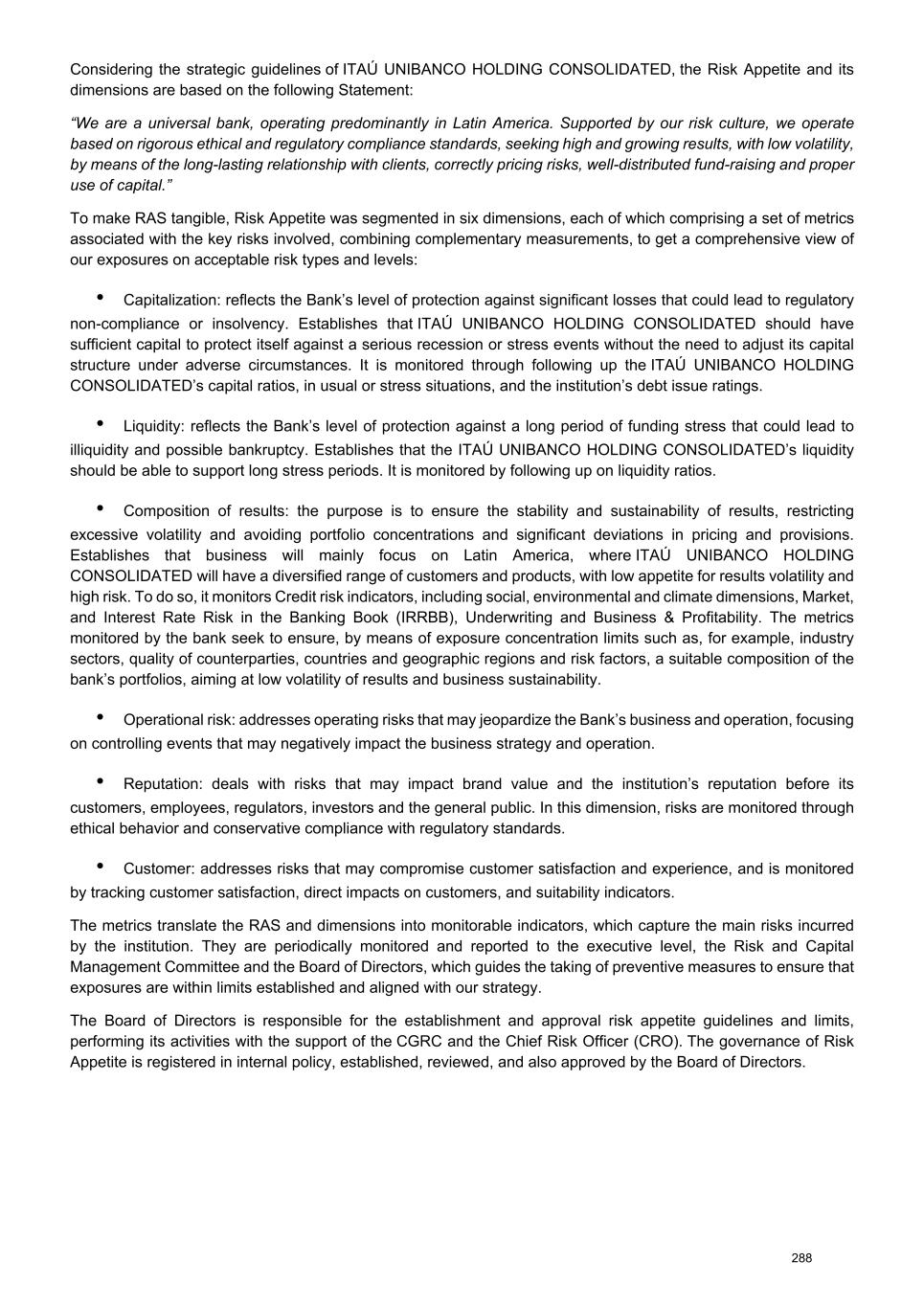 Considering the strategic guidelines of ITAÚ UNIBANCO HOLDING CONSOLIDATED, the Risk Appetite and its dimensions are based on the following Statement: “We are a universal bank, operating predominantly in Latin America. Supported by our risk culture, we operate based on rigorous ethical and regulatory compliance standards, seeking high and growing results, with low volatility, by means of the long-lasting relationship with clients, correctly pricing risks, well-distributed fund-raising and proper use of capital.” To make RAS tangible, Risk Appetite was segmented in six dimensions, each of which comprising a set of metrics associated with the key risks involved, combining complementary measurements, to get a comprehensive view of our exposures on acceptable risk types and levels: • Capitalization: reflects the Bank’s level of protection against significant losses that could lead to regulatory non-compliance or insolvency. Establishes that ITAÚ UNIBANCO HOLDING CONSOLIDATED should have sufficient capital to protect itself against a serious recession or stress events without the need to adjust its capital structure under adverse circumstances. It is monitored through following up the ITAÚ UNIBANCO HOLDING CONSOLIDATED’s capital ratios, in usual or stress situations, and the institution’s debt issue ratings. • Liquidity: reflects the Bank’s level of protection against a long period of funding stress that could lead to illiquidity and possible bankruptcy. Establishes that the ITAÚ UNIBANCO HOLDING CONSOLIDATED’s liquidity should be able to support long stress periods. It is monitored by following up on liquidity ratios. • Composition of results: the purpose is to ensure the stability and sustainability of results, restricting excessive volatility and avoiding portfolio concentrations and significant deviations in pricing and provisions. Establishes that business will mainly focus on Latin America, where ITAÚ UNIBANCO HOLDING CONSOLIDATED will have a diversified range of customers and products, with low appetite for results volatility and high risk. To do so, it monitors Credit risk indicators, including social, environmental and climate dimensions, Market, and Interest Rate Risk in the Banking Book (IRRBB), Underwriting and Business & Profitability. The metrics monitored by the bank seek to ensure, by means of exposure concentration limits such as, for example, industry sectors, quality of counterparties, countries and geographic regions and risk factors, a suitable composition of the bank’s portfolios, aiming at low volatility of results and business sustainability. • Operational risk: addresses operating risks that may jeopardize the Bank’s business and operation, focusing on controlling events that may negatively impact the business strategy and operation. • Reputation: deals with risks that may impact brand value and the institution’s reputation before its customers, employees, regulators, investors and the general public. In this dimension, risks are monitored through ethical behavior and conservative compliance with regulatory standards. • Customer: addresses risks that may compromise customer satisfaction and experience, and is monitored by tracking customer satisfaction, direct impacts on customers, and suitability indicators. The metrics translate the RAS and dimensions into monitorable indicators, which capture the main risks incurred by the institution. They are periodically monitored and reported to the executive level, the Risk and Capital Management Committee and the Board of Directors, which guides the taking of preventive measures to ensure that exposures are within limits established and aligned with our strategy. The Board of Directors is responsible for the establishment and approval risk appetite guidelines and limits, performing its activities with the support of the CGRC and the Chief Risk Officer (CRO). The governance of Risk Appetite is registered in internal policy, established, reviewed, and also approved by the Board of Directors. 288