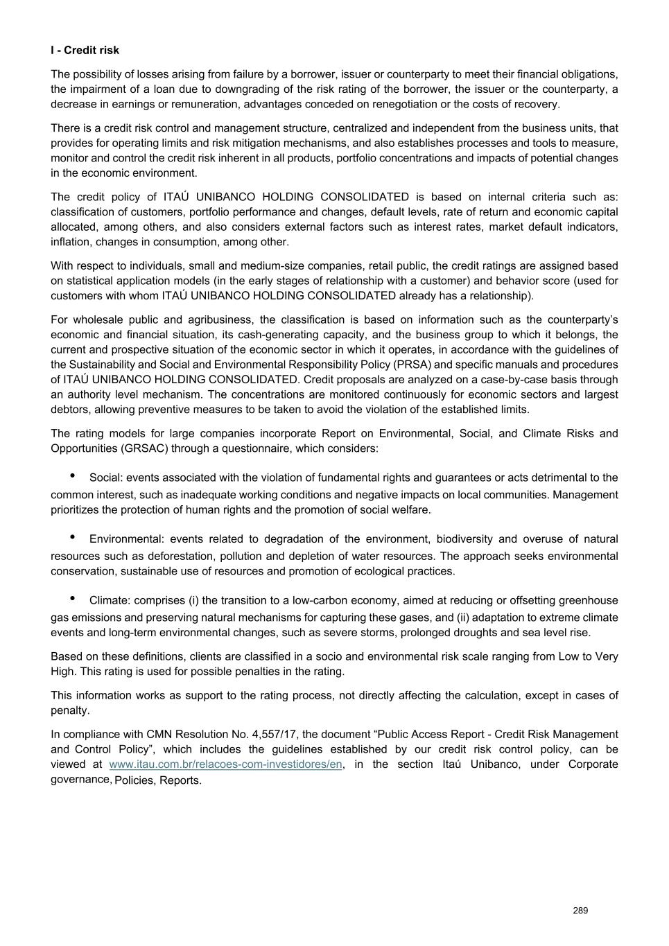 I - Credit risk The possibility of losses arising from failure by a borrower, issuer or counterparty to meet their financial obligations, the impairment of a loan due to downgrading of the risk rating of the borrower, the issuer or the counterparty, a decrease in earnings or remuneration, advantages conceded on renegotiation or the costs of recovery. There is a credit risk control and management structure, centralized and independent from the business units, that provides for operating limits and risk mitigation mechanisms, and also establishes processes and tools to measure, monitor and control the credit risk inherent in all products, portfolio concentrations and impacts of potential changes in the economic environment. The credit policy of ITAÚ UNIBANCO HOLDING CONSOLIDATED is based on internal criteria such as: classification of customers, portfolio performance and changes, default levels, rate of return and economic capital allocated, among others, and also considers external factors such as interest rates, market default indicators, inflation, changes in consumption, among other. With respect to individuals, small and medium-size companies, retail public, the credit ratings are assigned based on statistical application models (in the early stages of relationship with a customer) and behavior score (used for customers with whom ITAÚ UNIBANCO HOLDING CONSOLIDATED already has a relationship). For wholesale public and agribusiness, the classification is based on information such as the counterparty’s economic and financial situation, its cash-generating capacity, and the business group to which it belongs, the current and prospective situation of the economic sector in which it operates, in accordance with the guidelines of the Sustainability and Social and Environmental Responsibility Policy (PRSA) and specific manuals and procedures of ITAÚ UNIBANCO HOLDING CONSOLIDATED. Credit proposals are analyzed on a case-by-case basis through an authority level mechanism. The concentrations are monitored continuously for economic sectors and largest debtors, allowing preventive measures to be taken to avoid the violation of the established limits. The rating models for large companies incorporate Report on Environmental, Social, and Climate Risks and Opportunities (GRSAC) through a questionnaire, which considers: • Social: events associated with the violation of fundamental rights and guarantees or acts detrimental to the common interest, such as inadequate working conditions and negative impacts on local communities. Management prioritizes the protection of human rights and the promotion of social welfare. • Environmental: events related to degradation of the environment, biodiversity and overuse of natural resources such as deforestation, pollution and depletion of water resources. The approach seeks environmental conservation, sustainable use of resources and promotion of ecological practices. • Climate: comprises (i) the transition to a low-carbon economy, aimed at reducing or offsetting greenhouse gas emissions and preserving natural mechanisms for capturing these gases, and (ii) adaptation to extreme climate events and long-term environmental changes, such as severe storms, prolonged droughts and sea level rise. Based on these definitions, clients are classified in a socio and environmental risk scale ranging from Low to Very High. This rating is used for possible penalties in the rating. This information works as support to the rating process, not directly affecting the calculation, except in cases of penalty. In compliance with CMN Resolution No. 4,557/17, the document “Public Access Report - Credit Risk Management and Control Policy”, which includes the guidelines established by our credit risk control policy, can be viewed at www.itau.com.br/relacoes-com-investidores/en, in the section Itaú Unibanco, under Corporate governance, Policies, Reports. 289