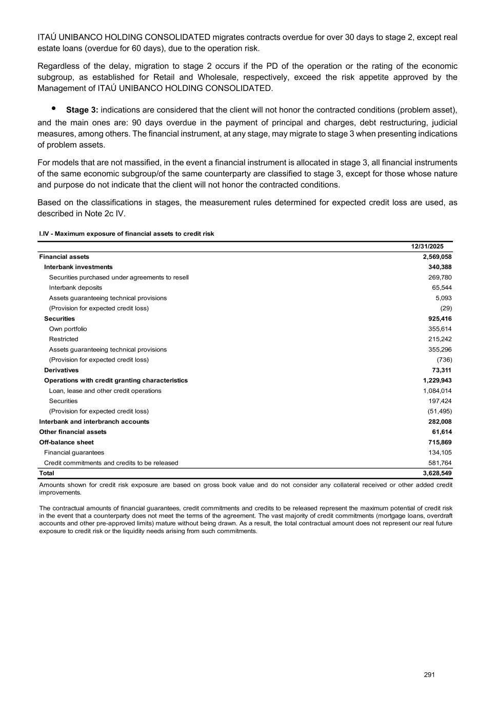 ITAÚ UNIBANCO HOLDING CONSOLIDATED migrates contracts overdue for over 30 days to stage 2, except real estate loans (overdue for 60 days), due to the operation risk. Regardless of the delay, migration to stage 2 occurs if the PD of the operation or the rating of the economic subgroup, as established for Retail and Wholesale, respectively, exceed the risk appetite approved by the Management of ITAÚ UNIBANCO HOLDING CONSOLIDATED. • Stage 3: indications are considered that the client will not honor the contracted conditions (problem asset), and the main ones are: 90 days overdue in the payment of principal and charges, debt restructuring, judicial measures, among others. The financial instrument, at any stage, may migrate to stage 3 when presenting indications of problem assets. For models that are not massified, in the event a financial instrument is allocated in stage 3, all financial instruments of the same economic subgroup/of the same counterparty are classified to stage 3, except for those whose nature and purpose do not indicate that the client will not honor the contracted conditions. Based on the classifications in stages, the measurement rules determined for expected credit loss are used, as described in Note 2c IV. I.IV - Maximum exposure of financial assets to credit risk 12/31/2025 Financial assets 2,569,058 Interbank investments 340,388 Securities purchased under agreements to resell 269,780 Interbank deposits 65,544 Assets guaranteeing technical provisions 5,093 (Provision for expected credit loss) (29) Securities 925,416 Own portfolio 355,614 Restricted 215,242 Assets guaranteeing technical provisions 355,296 (Provision for expected credit loss) (736) Derivatives 73,311 Operations with credit granting characteristics 1,229,943 Loan, lease and other credit operations 1,084,014 Securities 197,424 (Provision for expected credit loss) (51,495) Interbank and interbranch accounts 282,008 Other financial assets 61,614 Off-balance sheet 715,869 Financial guarantees 134,105 Credit commitments and credits to be released 581,764 Total 3,628,549 Amounts shown for credit risk exposure are based on gross book value and do not consider any collateral received or other added credit improvements. The contractual amounts of financial guarantees, credit commitments and credits to be released represent the maximum potential of credit risk in the event that a counterparty does not meet the terms of the agreement. The vast majority of credit commitments (mortgage loans, overdraft accounts and other pre-approved limits) mature without being drawn. As a result, the total contractual amount does not represent our real future exposure to credit risk or the liquidity needs arising from such commitments. 291