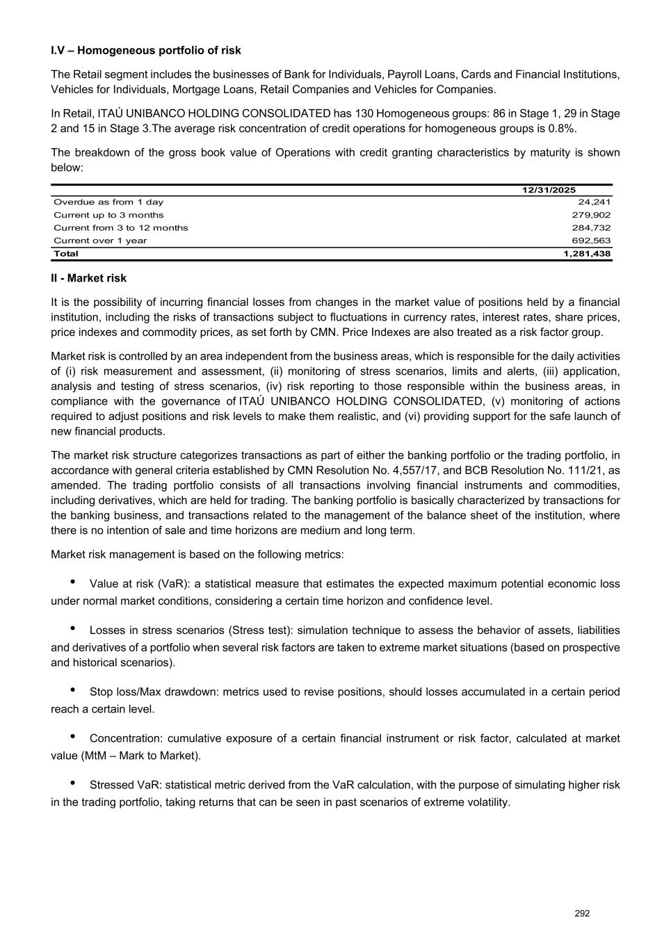 I.V – Homogeneous portfolio of risk The Retail segment includes the businesses of Bank for Individuals, Payroll Loans, Cards and Financial Institutions, Vehicles for Individuals, Mortgage Loans, Retail Companies and Vehicles for Companies. In Retail, ITAÚ UNIBANCO HOLDING CONSOLIDATED has 130 Homogeneous groups: 86 in Stage 1, 29 in Stage 2 and 15 in Stage 3.The average risk concentration of credit operations for homogeneous groups is 0.8%. The breakdown of the gross book value of Operations with credit granting characteristics by maturity is shown below: 12/31/2025 Overdue as from 1 day 24,241 Current up to 3 months 279,902 Current from 3 to 12 months 284,732 Current over 1 year 692,563 Total 1,281,438 II - Market risk It is the possibility of incurring financial losses from changes in the market value of positions held by a financial institution, including the risks of transactions subject to fluctuations in currency rates, interest rates, share prices, price indexes and commodity prices, as set forth by CMN. Price Indexes are also treated as a risk factor group. Market risk is controlled by an area independent from the business areas, which is responsible for the daily activities of (i) risk measurement and assessment, (ii) monitoring of stress scenarios, limits and alerts, (iii) application, analysis and testing of stress scenarios, (iv) risk reporting to those responsible within the business areas, in compliance with the governance of ITAÚ UNIBANCO HOLDING CONSOLIDATED, (v) monitoring of actions required to adjust positions and risk levels to make them realistic, and (vi) providing support for the safe launch of new financial products. The market risk structure categorizes transactions as part of either the banking portfolio or the trading portfolio, in accordance with general criteria established by CMN Resolution No. 4,557/17, and BCB Resolution No. 111/21, as amended. The trading portfolio consists of all transactions involving financial instruments and commodities, including derivatives, which are held for trading. The banking portfolio is basically characterized by transactions for the banking business, and transactions related to the management of the balance sheet of the institution, where there is no intention of sale and time horizons are medium and long term. Market risk management is based on the following metrics: • Value at risk (VaR): a statistical measure that estimates the expected maximum potential economic loss under normal market conditions, considering a certain time horizon and confidence level. • Losses in stress scenarios (Stress test): simulation technique to assess the behavior of assets, liabilities and derivatives of a portfolio when several risk factors are taken to extreme market situations (based on prospective and historical scenarios). • Stop loss/Max drawdown: metrics used to revise positions, should losses accumulated in a certain period reach a certain level. • Concentration: cumulative exposure of a certain financial instrument or risk factor, calculated at market value (MtM – Mark to Market). • Stressed VaR: statistical metric derived from the VaR calculation, with the purpose of simulating higher risk in the trading portfolio, taking returns that can be seen in past scenarios of extreme volatility. 292