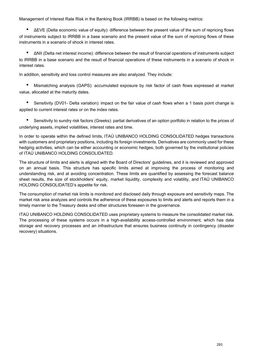 Management of Interest Rate Risk in the Banking Book (IRRBB) is based on the following metrics: • ΔEVE (Delta economic value of equity): difference between the present value of the sum of repricing flows of instruments subject to IRRBB in a base scenario and the present value of the sum of repricing flows of these instruments in a scenario of shock in interest rates. • ΔNII (Delta net interest income): difference between the result of financial operations of instruments subject to IRRBB in a base scenario and the result of financial operations of these instruments in a scenario of shock in interest rates. In addition, sensitivity and loss control measures are also analyzed. They include: • Mismatching analysis (GAPS): accumulated exposure by risk factor of cash flows expressed at market value, allocated at the maturity dates. • Sensitivity (DV01- Delta variation): impact on the fair value of cash flows when a 1 basis point change is applied to current interest rates or on the index rates. • Sensitivity to sundry risk factors (Greeks): partial derivatives of an option portfolio in relation to the prices of underlying assets, implied volatilities, interest rates and time. In order to operate within the defined limits, ITAÚ UNIBANCO HOLDING CONSOLIDATED hedges transactions with customers and proprietary positions, including its foreign investments. Derivatives are commonly used for these hedging activities, which can be either accounting or economic hedges, both governed by the institutional policies of ITAÚ UNIBANCO HOLDING CONSOLIDATED. The structure of limits and alerts is aligned with the Board of Directors’ guidelines, and it is reviewed and approved on an annual basis. This structure has specific limits aimed at improving the process of monitoring and understanding risk, and at avoiding concentration. These limits are quantified by assessing the forecast balance sheet results, the size of stockholders’ equity, market liquidity, complexity and volatility, and ITAÚ UNIBANCO HOLDING CONSOLIDATED’s appetite for risk. The consumption of market risk limits is monitored and disclosed daily through exposure and sensitivity maps. The market risk area analyzes and controls the adherence of these exposures to limits and alerts and reports them in a timely manner to the Treasury desks and other structures foreseen in the governance. ITAÚ UNIBANCO HOLDING CONSOLIDATED uses proprietary systems to measure the consolidated market risk. The processing of these systems occurs in a high-availability access-controlled environment, which has data storage and recovery processes and an infrastructure that ensures business continuity in contingency (disaster recovery) situations. 293