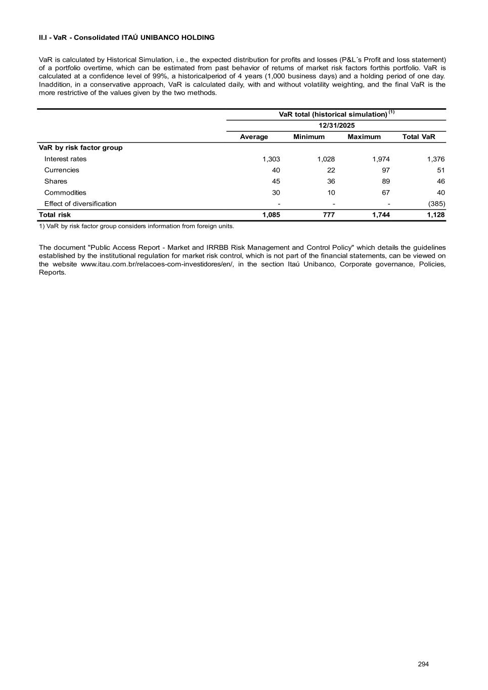 II.I - VaR - Consolidated ITAÚ UNIBANCO HOLDING VaR is calculated by Historical Simulation, i.e., the expected distribution for profits and losses (P&L´s Profit and loss statement) of a portfolio overtime, which can be estimated from past behavior of returns of market risk factors forthis portfolio. VaR is calculated at a confidence level of 99%, a historicalperiod of 4 years (1,000 business days) and a holding period of one day. Inaddition, in a conservative approach, VaR is calculated daily, with and without volatility weighting, and the final VaR is the more restrictive of the values given by the two methods. VaR total (historical simulation) (1) 12/31/2025 Average Minimum Maximum Total VaR VaR by risk factor group Interest rates 1,303 1,028 1,974 1,376 Currencies 40 22 97 51 Shares 45 36 89 46 Commodities 30 10 67 40 Effect of diversification - - - (385) Total risk 1,085 777 1,744 1,128 1) VaR by risk factor group considers information from foreign units. The document "Public Access Report - Market and IRRBB Risk Management and Control Policy" which details the guidelines established by the institutional regulation for market risk control, which is not part of the financial statements, can be viewed on the website www.itau.com.br/relacoes-com-investidores/en/, in the section Itaú Unibanco, Corporate governance, Policies, Reports. 294