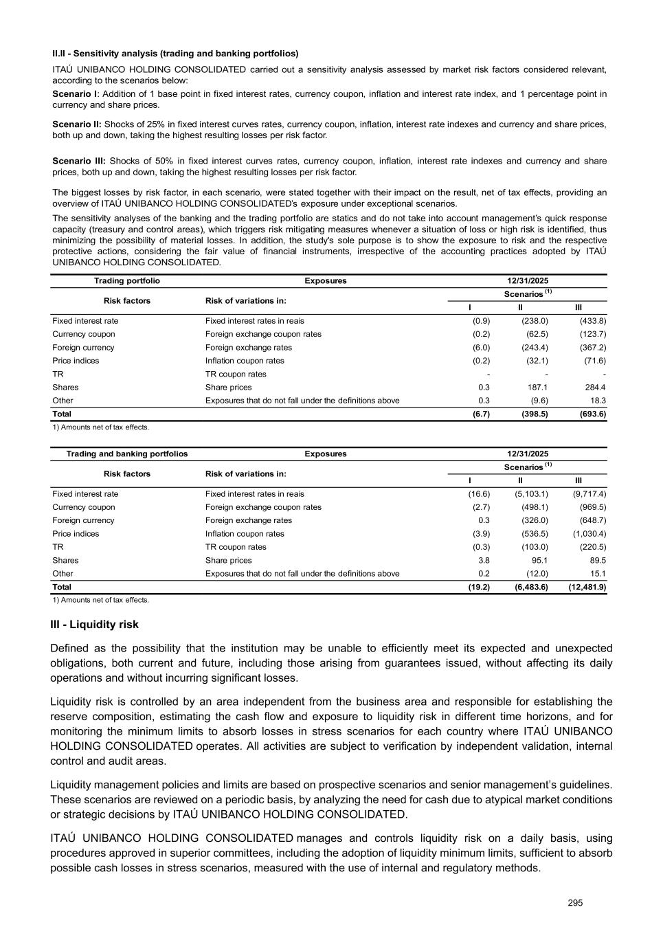 II.ll - Sensitivity analysis (trading and banking portfolios) ITAÚ UNIBANCO HOLDING CONSOLIDATED carried out a sensitivity analysis assessed by market risk factors considered relevant, according to the scenarios below: Scenario I: Addition of 1 base point in fixed interest rates, currency coupon, inflation and interest rate index, and 1 percentage point in currency and share prices. Scenario II: Shocks of 25% in fixed interest curves rates, currency coupon, inflation, interest rate indexes and currency and share prices, both up and down, taking the highest resulting losses per risk factor. Scenario III: Shocks of 50% in fixed interest curves rates, currency coupon, inflation, interest rate indexes and currency and share prices, both up and down, taking the highest resulting losses per risk factor. The biggest losses by risk factor, in each scenario, were stated together with their impact on the result, net of tax effects, providing an overview of ITAÚ UNIBANCO HOLDING CONSOLIDATED’s exposure under exceptional scenarios. The sensitivity analyses of the banking and the trading portfolio are statics and do not take into account management’s quick response capacity (treasury and control areas), which triggers risk mitigating measures whenever a situation of loss or high risk is identified, thus minimizing the possibility of material losses. In addition, the study's sole purpose is to show the exposure to risk and the respective protective actions, considering the fair value of financial instruments, irrespective of the accounting practices adopted by ITAÚ UNIBANCO HOLDING CONSOLIDATED. Trading portfolio Exposures 12/31/2025 Risk factors Risk of variations in: Scenarios (1) I II III Fixed interest rate Fixed interest rates in reais (0.9) (238.0) (433.8) Currency coupon Foreign exchange coupon rates (0.2) (62.5) (123.7) Foreign currency Foreign exchange rates (6.0) (243.4) (367.2) Price indices Inflation coupon rates (0.2) (32.1) (71.6) TR TR coupon rates - - - Shares Share prices 0.3 187.1 284.4 Other Exposures that do not fall under the definitions above 0.3 (9.6) 18.3 Total (6.7) (398.5) (693.6) 1) Amounts net of tax effects. Trading and banking portfolios Exposures 12/31/2025 Risk factors Risk of variations in: Scenarios (1) I II III Fixed interest rate Fixed interest rates in reais (16.6) (5,103.1) (9,717.4) Currency coupon Foreign exchange coupon rates (2.7) (498.1) (969.5) Foreign currency Foreign exchange rates 0.3 (326.0) (648.7) Price indices Inflation coupon rates (3.9) (536.5) (1,030.4) TR TR coupon rates (0.3) (103.0) (220.5) Shares Share prices 3.8 95.1 89.5 Other Exposures that do not fall under the definitions above 0.2 (12.0) 15.1 Total (19.2) (6,483.6) (12,481.9) 1) Amounts net of tax effects. III - Liquidity risk Defined as the possibility that the institution may be unable to efficiently meet its expected and unexpected obligations, both current and future, including those arising from guarantees issued, without affecting its daily operations and without incurring significant losses. Liquidity risk is controlled by an area independent from the business area and responsible for establishing the reserve composition, estimating the cash flow and exposure to liquidity risk in different time horizons, and for monitoring the minimum limits to absorb losses in stress scenarios for each country where ITAÚ UNIBANCO HOLDING CONSOLIDATED operates. All activities are subject to verification by independent validation, internal control and audit areas. Liquidity management policies and limits are based on prospective scenarios and senior management’s guidelines. These scenarios are reviewed on a periodic basis, by analyzing the need for cash due to atypical market conditions or strategic decisions by ITAÚ UNIBANCO HOLDING CONSOLIDATED. ITAÚ UNIBANCO HOLDING CONSOLIDATED manages and controls liquidity risk on a daily basis, using procedures approved in superior committees, including the adoption of liquidity minimum limits, sufficient to absorb possible cash losses in stress scenarios, measured with the use of internal and regulatory methods. 295
