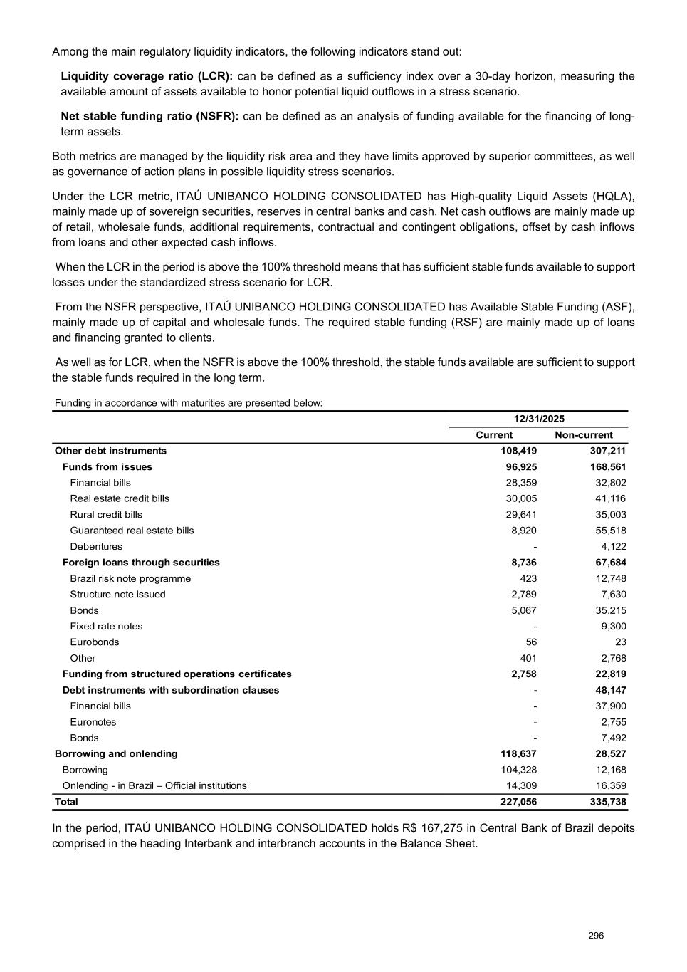 Among the main regulatory liquidity indicators, the following indicators stand out: Liquidity coverage ratio (LCR): can be defined as a sufficiency index over a 30-day horizon, measuring the available amount of assets available to honor potential liquid outflows in a stress scenario. Net stable funding ratio (NSFR): can be defined as an analysis of funding available for the financing of long- term assets. Both metrics are managed by the liquidity risk area and they have limits approved by superior committees, as well as governance of action plans in possible liquidity stress scenarios. Under the LCR metric, ITAÚ UNIBANCO HOLDING CONSOLIDATED has High-quality Liquid Assets (HQLA), mainly made up of sovereign securities, reserves in central banks and cash. Net cash outflows are mainly made up of retail, wholesale funds, additional requirements, contractual and contingent obligations, offset by cash inflows from loans and other expected cash inflows. When the LCR in the period is above the 100% threshold means that has sufficient stable funds available to support losses under the standardized stress scenario for LCR. From the NSFR perspective, ITAÚ UNIBANCO HOLDING CONSOLIDATED has Available Stable Funding (ASF), mainly made up of capital and wholesale funds. The required stable funding (RSF) are mainly made up of loans and financing granted to clients. As well as for LCR, when the NSFR is above the 100% threshold, the stable funds available are sufficient to support the stable funds required in the long term. Funding in accordance with maturities are presented below: 12/31/2025 Current Non-current Other debt instruments 108,419 307,211 Funds from issues 96,925 168,561 Financial bills 28,359 32,802 Real estate credit bills 30,005 41,116 Rural credit bills 29,641 35,003 Guaranteed real estate bills 8,920 55,518 Debentures - 4,122 Foreign loans through securities 8,736 67,684 Brazil risk note programme 423 12,748 Structure note issued 2,789 7,630 Bonds 5,067 35,215 Fixed rate notes - 9,300 Eurobonds 56 23 Other 401 2,768 Funding from structured operations certificates 2,758 22,819 Debt instruments with subordination clauses - 48,147 Financial bills - 37,900 Euronotes - 2,755 Bonds - 7,492 Borrowing and onlending 118,637 28,527 Borrowing 104,328 12,168 Onlending - in Brazil – Official institutions 14,309 16,359 Total 227,056 335,738 In the period, ITAÚ UNIBANCO HOLDING CONSOLIDATED holds R$ 167,275 in Central Bank of Brazil depoits comprised in the heading Interbank and interbranch accounts in the Balance Sheet. 296