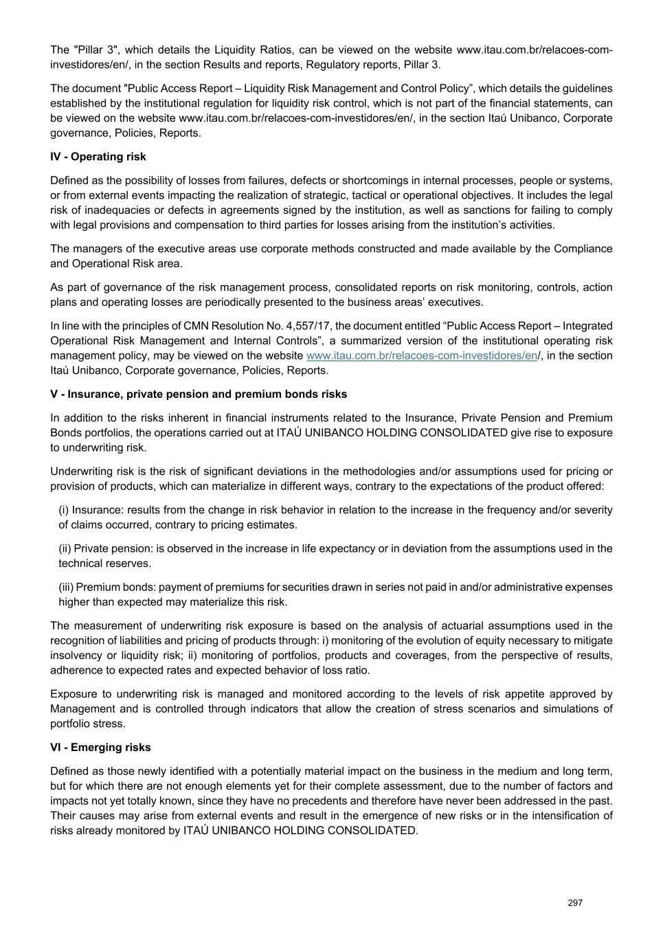 The "Pillar 3", which details the Liquidity Ratios, can be viewed on the website www.itau.com.br/relacoes-com- investidores/en/, in the section Results and reports, Regulatory reports, Pillar 3. The document "Public Access Report – Liquidity Risk Management and Control Policy”, which details the guidelines established by the institutional regulation for liquidity risk control, which is not part of the financial statements, can be viewed on the website www.itau.com.br/relacoes-com-investidores/en/, in the section Itaú Unibanco, Corporate governance, Policies, Reports. IV - Operating risk Defined as the possibility of losses from failures, defects or shortcomings in internal processes, people or systems, or from external events impacting the realization of strategic, tactical or operational objectives. It includes the legal risk of inadequacies or defects in agreements signed by the institution, as well as sanctions for failing to comply with legal provisions and compensation to third parties for losses arising from the institution’s activities. The managers of the executive areas use corporate methods constructed and made available by the Compliance and Operational Risk area. As part of governance of the risk management process, consolidated reports on risk monitoring, controls, action plans and operating losses are periodically presented to the business areas’ executives. In line with the principles of CMN Resolution No. 4,557/17, the document entitled “Public Access Report – Integrated Operational Risk Management and Internal Controls”, a summarized version of the institutional operating risk management policy, may be viewed on the website www.itau.com.br/relacoes-com-investidores/en/, in the section Itaú Unibanco, Corporate governance, Policies, Reports. V - Insurance, private pension and premium bonds risks In addition to the risks inherent in financial instruments related to the Insurance, Private Pension and Premium Bonds portfolios, the operations carried out at ITAÚ UNIBANCO HOLDING CONSOLIDATED give rise to exposure to underwriting risk. Underwriting risk is the risk of significant deviations in the methodologies and/or assumptions used for pricing or provision of products, which can materialize in different ways, contrary to the expectations of the product offered: (i) Insurance: results from the change in risk behavior in relation to the increase in the frequency and/or severity of claims occurred, contrary to pricing estimates. (ii) Private pension: is observed in the increase in life expectancy or in deviation from the assumptions used in the technical reserves. (iii) Premium bonds: payment of premiums for securities drawn in series not paid in and/or administrative expenses higher than expected may materialize this risk. The measurement of underwriting risk exposure is based on the analysis of actuarial assumptions used in the recognition of liabilities and pricing of products through: i) monitoring of the evolution of equity necessary to mitigate insolvency or liquidity risk; ii) monitoring of portfolios, products and coverages, from the perspective of results, adherence to expected rates and expected behavior of loss ratio. Exposure to underwriting risk is managed and monitored according to the levels of risk appetite approved by Management and is controlled through indicators that allow the creation of stress scenarios and simulations of portfolio stress. VI - Emerging risks Defined as those newly identified with a potentially material impact on the business in the medium and long term, but for which there are not enough elements yet for their complete assessment, due to the number of factors and impacts not yet totally known, since they have no precedents and therefore have never been addressed in the past. Their causes may arise from external events and result in the emergence of new risks or in the intensification of risks already monitored by ITAÚ UNIBANCO HOLDING CONSOLIDATED. 297