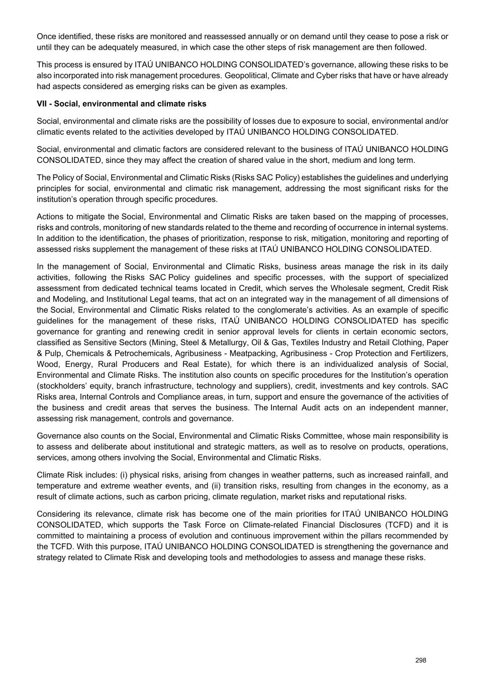 Once identified, these risks are monitored and reassessed annually or on demand until they cease to pose a risk or until they can be adequately measured, in which case the other steps of risk management are then followed. This process is ensured by ITAÚ UNIBANCO HOLDING CONSOLIDATED’s governance, allowing these risks to be also incorporated into risk management procedures. Geopolitical, Climate and Cyber risks that have or have already had aspects considered as emerging risks can be given as examples. VII - Social, environmental and climate risks Social, environmental and climate risks are the possibility of losses due to exposure to social, environmental and/or climatic events related to the activities developed by ITAÚ UNIBANCO HOLDING CONSOLIDATED. Social, environmental and climatic factors are considered relevant to the business of ITAÚ UNIBANCO HOLDING CONSOLIDATED, since they may affect the creation of shared value in the short, medium and long term. The Policy of Social, Environmental and Climatic Risks (Risks SAC Policy) establishes the guidelines and underlying principles for social, environmental and climatic risk management, addressing the most significant risks for the institution’s operation through specific procedures. Actions to mitigate the Social, Environmental and Climatic Risks are taken based on the mapping of processes, risks and controls, monitoring of new standards related to the theme and recording of occurrence in internal systems. In addition to the identification, the phases of prioritization, response to risk, mitigation, monitoring and reporting of assessed risks supplement the management of these risks at ITAÚ UNIBANCO HOLDING CONSOLIDATED. In the management of Social, Environmental and Climatic Risks, business areas manage the risk in its daily activities, following the Risks SAC Policy guidelines and specific processes, with the support of specialized assessment from dedicated technical teams located in Credit, which serves the Wholesale segment, Credit Risk and Modeling, and Institutional Legal teams, that act on an integrated way in the management of all dimensions of the Social, Environmental and Climatic Risks related to the conglomerate’s activities. As an example of specific guidelines for the management of these risks, ITAÚ UNIBANCO HOLDING CONSOLIDATED has specific governance for granting and renewing credit in senior approval levels for clients in certain economic sectors, classified as Sensitive Sectors (Mining, Steel & Metallurgy, Oil & Gas, Textiles Industry and Retail Clothing, Paper & Pulp, Chemicals & Petrochemicals, Agribusiness - Meatpacking, Agribusiness - Crop Protection and Fertilizers, Wood, Energy, Rural Producers and Real Estate), for which there is an individualized analysis of Social, Environmental and Climate Risks. The institution also counts on specific procedures for the Institution’s operation (stockholders’ equity, branch infrastructure, technology and suppliers), credit, investments and key controls. SAC Risks area, Internal Controls and Compliance areas, in turn, support and ensure the governance of the activities of the business and credit areas that serves the business. The Internal Audit acts on an independent manner, assessing risk management, controls and governance. Governance also counts on the Social, Environmental and Climatic Risks Committee, whose main responsibility is to assess and deliberate about institutional and strategic matters, as well as to resolve on products, operations, services, among others involving the Social, Environmental and Climatic Risks. Climate Risk includes: (i) physical risks, arising from changes in weather patterns, such as increased rainfall, and temperature and extreme weather events, and (ii) transition risks, resulting from changes in the economy, as a result of climate actions, such as carbon pricing, climate regulation, market risks and reputational risks. Considering its relevance, climate risk has become one of the main priorities for ITAÚ UNIBANCO HOLDING CONSOLIDATED, which supports the Task Force on Climate-related Financial Disclosures (TCFD) and it is committed to maintaining a process of evolution and continuous improvement within the pillars recommended by the TCFD. With this purpose, ITAÚ UNIBANCO HOLDING CONSOLIDATED is strengthening the governance and strategy related to Climate Risk and developing tools and methodologies to assess and manage these risks. 298