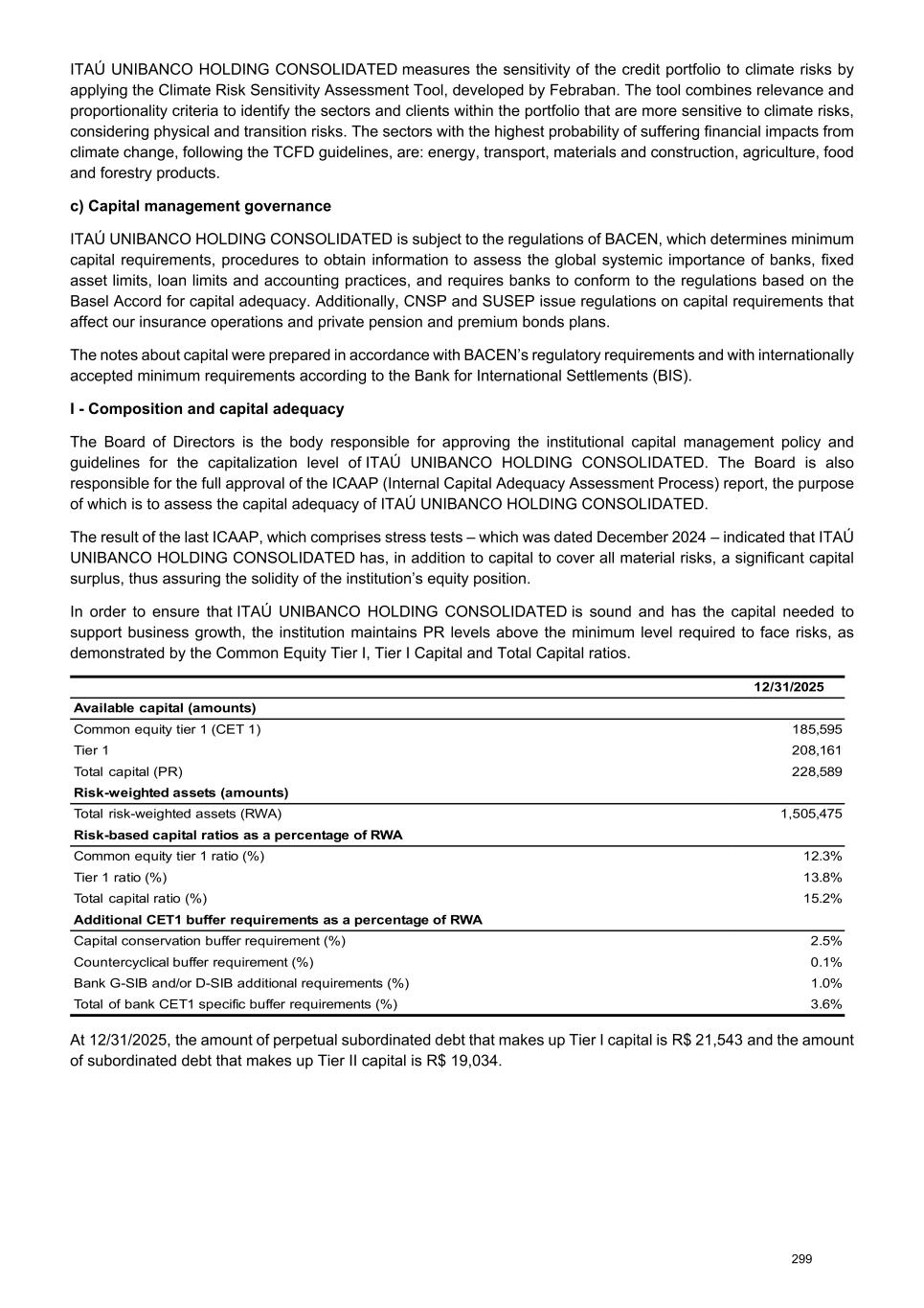 ITAÚ UNIBANCO HOLDING CONSOLIDATED measures the sensitivity of the credit portfolio to climate risks by applying the Climate Risk Sensitivity Assessment Tool, developed by Febraban. The tool combines relevance and proportionality criteria to identify the sectors and clients within the portfolio that are more sensitive to climate risks, considering physical and transition risks. The sectors with the highest probability of suffering financial impacts from climate change, following the TCFD guidelines, are: energy, transport, materials and construction, agriculture, food and forestry products. c) Capital management governance ITAÚ UNIBANCO HOLDING CONSOLIDATED is subject to the regulations of BACEN, which determines minimum capital requirements, procedures to obtain information to assess the global systemic importance of banks, fixed asset limits, loan limits and accounting practices, and requires banks to conform to the regulations based on the Basel Accord for capital adequacy. Additionally, CNSP and SUSEP issue regulations on capital requirements that affect our insurance operations and private pension and premium bonds plans. The notes about capital were prepared in accordance with BACEN’s regulatory requirements and with internationally accepted minimum requirements according to the Bank for International Settlements (BIS). I - Composition and capital adequacy The Board of Directors is the body responsible for approving the institutional capital management policy and guidelines for the capitalization level of ITAÚ UNIBANCO HOLDING CONSOLIDATED. The Board is also responsible for the full approval of the ICAAP (Internal Capital Adequacy Assessment Process) report, the purpose of which is to assess the capital adequacy of ITAÚ UNIBANCO HOLDING CONSOLIDATED. The result of the last ICAAP, which comprises stress tests – which was dated December 2024 – indicated that ITAÚ UNIBANCO HOLDING CONSOLIDATED has, in addition to capital to cover all material risks, a significant capital surplus, thus assuring the solidity of the institution’s equity position. In order to ensure that ITAÚ UNIBANCO HOLDING CONSOLIDATED is sound and has the capital needed to support business growth, the institution maintains PR levels above the minimum level required to face risks, as demonstrated by the Common Equity Tier I, Tier I Capital and Total Capital ratios. 12/31/2025 Available capital (amounts) Common equity tier 1 (CET 1) 185,595 Tier 1 208,161 Total capital (PR) 228,589 Risk-weighted assets (amounts) Total risk-weighted assets (RWA) 1,505,475 Risk-based capital ratios as a percentage of RWA Common equity tier 1 ratio (%) 12.3% Tier 1 ratio (%) 13.8% Total capital ratio (%) 15.2% Additional CET1 buffer requirements as a percentage of RWA Capital conservation buffer requirement (%) 2.5% Countercyclical buffer requirement (%) 0.1% Bank G-SIB and/or D-SIB additional requirements (%) 1.0% Total of bank CET1 specific buffer requirements (%) 3.6% At 12/31/2025, the amount of perpetual subordinated debt that makes up Tier I capital is R$ 21,543 and the amount of subordinated debt that makes up Tier II capital is R$ 19,034. 299