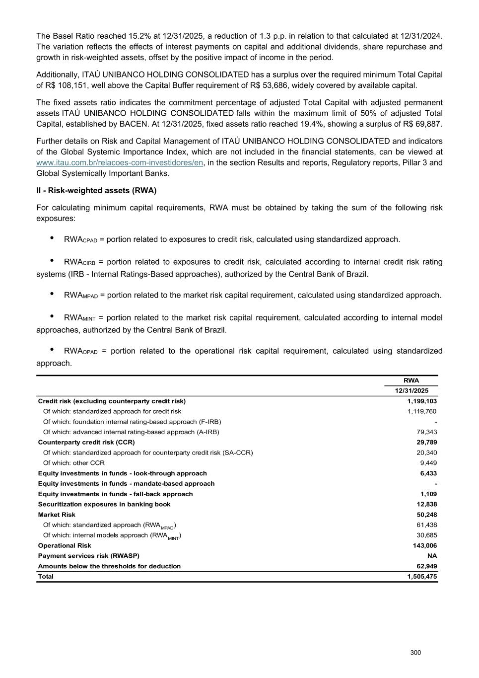 The Basel Ratio reached 15.2% at 12/31/2025, a reduction of 1.3 p.p. in relation to that calculated at 12/31/2024. The variation reflects the effects of interest payments on capital and additional dividends, share repurchase and growth in risk-weighted assets, offset by the positive impact of income in the period. Additionally, ITAÚ UNIBANCO HOLDING CONSOLIDATED has a surplus over the required minimum Total Capital of R$ 108,151, well above the Capital Buffer requirement of R$ 53,686, widely covered by available capital. The fixed assets ratio indicates the commitment percentage of adjusted Total Capital with adjusted permanent assets ITAÚ UNIBANCO HOLDING CONSOLIDATED falls within the maximum limit of 50% of adjusted Total Capital, established by BACEN. At 12/31/2025, fixed assets ratio reached 19.4%, showing a surplus of R$ 69,887. Further details on Risk and Capital Management of ITAÚ UNIBANCO HOLDING CONSOLIDATED and indicators of the Global Systemic Importance Index, which are not included in the financial statements, can be viewed at www.itau.com.br/relacoes-com-investidores/en, in the section Results and reports, Regulatory reports, Pillar 3 and Global Systemically Important Banks. II - Risk-weighted assets (RWA) For calculating minimum capital requirements, RWA must be obtained by taking the sum of the following risk exposures: • RWACPAD = portion related to exposures to credit risk, calculated using standardized approach. • RWACIRB = portion related to exposures to credit risk, calculated according to internal credit risk rating systems (IRB - Internal Ratings-Based approaches), authorized by the Central Bank of Brazil. • RWAMPAD = portion related to the market risk capital requirement, calculated using standardized approach. • RWAMINT = portion related to the market risk capital requirement, calculated according to internal model approaches, authorized by the Central Bank of Brazil. • RWAOPAD = portion related to the operational risk capital requirement, calculated using standardized approach. RWA 12/31/2025 Credit risk (excluding counterparty credit risk) 1,199,103 Of which: standardized approach for credit risk 1,119,760 Of which: foundation internal rating-based approach (F-IRB) - Of which: advanced internal rating-based approach (A-IRB) 79,343 Counterparty credit risk (CCR) 29,789 Of which: standardized approach for counterparty credit risk (SA-CCR) 20,340 Of which: other CCR 9,449 Equity investments in funds - look-through approach 6,433 Equity investments in funds - mandate-based approach - Equity investments in funds - fall-back approach 1,109 Securitization exposures in banking book 12,838 Market Risk 50,248 Of which: standardized approach (RWAMPAD) 61,438 Of which: internal models approach (RWAMINT) 30,685 Operational Risk 143,006 Payment services risk (RWASP) NA Amounts below the thresholds for deduction 62,949 Total 1,505,475 300