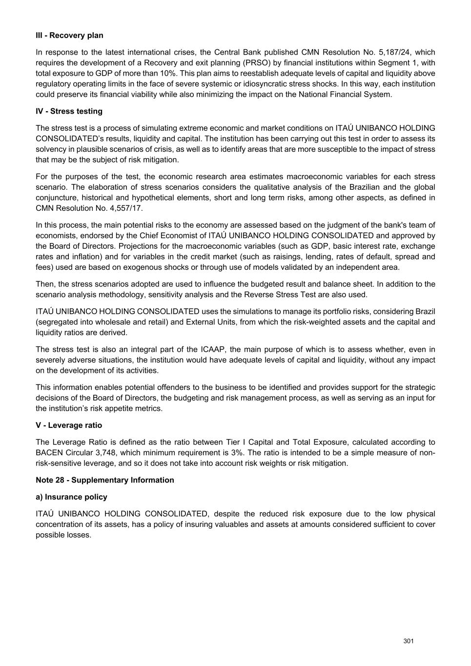 III - Recovery plan In response to the latest international crises, the Central Bank published CMN Resolution No. 5,187/24, which requires the development of a Recovery and exit planning (PRSO) by financial institutions within Segment 1, with total exposure to GDP of more than 10%. This plan aims to reestablish adequate levels of capital and liquidity above regulatory operating limits in the face of severe systemic or idiosyncratic stress shocks. In this way, each institution could preserve its financial viability while also minimizing the impact on the National Financial System. IV - Stress testing The stress test is a process of simulating extreme economic and market conditions on ITAÚ UNIBANCO HOLDING CONSOLIDATED’s results, liquidity and capital. The institution has been carrying out this test in order to assess its solvency in plausible scenarios of crisis, as well as to identify areas that are more susceptible to the impact of stress that may be the subject of risk mitigation. For the purposes of the test, the economic research area estimates macroeconomic variables for each stress scenario. The elaboration of stress scenarios considers the qualitative analysis of the Brazilian and the global conjuncture, historical and hypothetical elements, short and long term risks, among other aspects, as defined in CMN Resolution No. 4,557/17. In this process, the main potential risks to the economy are assessed based on the judgment of the bank's team of economists, endorsed by the Chief Economist of ITAÚ UNIBANCO HOLDING CONSOLIDATED and approved by the Board of Directors. Projections for the macroeconomic variables (such as GDP, basic interest rate, exchange rates and inflation) and for variables in the credit market (such as raisings, lending, rates of default, spread and fees) used are based on exogenous shocks or through use of models validated by an independent area. Then, the stress scenarios adopted are used to influence the budgeted result and balance sheet. In addition to the scenario analysis methodology, sensitivity analysis and the Reverse Stress Test are also used. ITAÚ UNIBANCO HOLDING CONSOLIDATED uses the simulations to manage its portfolio risks, considering Brazil (segregated into wholesale and retail) and External Units, from which the risk-weighted assets and the capital and liquidity ratios are derived. The stress test is also an integral part of the ICAAP, the main purpose of which is to assess whether, even in severely adverse situations, the institution would have adequate levels of capital and liquidity, without any impact on the development of its activities. This information enables potential offenders to the business to be identified and provides support for the strategic decisions of the Board of Directors, the budgeting and risk management process, as well as serving as an input for the institution’s risk appetite metrics. V - Leverage ratio The Leverage Ratio is defined as the ratio between Tier I Capital and Total Exposure, calculated according to BACEN Circular 3,748, which minimum requirement is 3%. The ratio is intended to be a simple measure of non- risk-sensitive leverage, and so it does not take into account risk weights or risk mitigation. Note 28 - Supplementary Information a) Insurance policy ITAÚ UNIBANCO HOLDING CONSOLIDATED, despite the reduced risk exposure due to the low physical concentration of its assets, has a policy of insuring valuables and assets at amounts considered sufficient to cover possible losses. 301