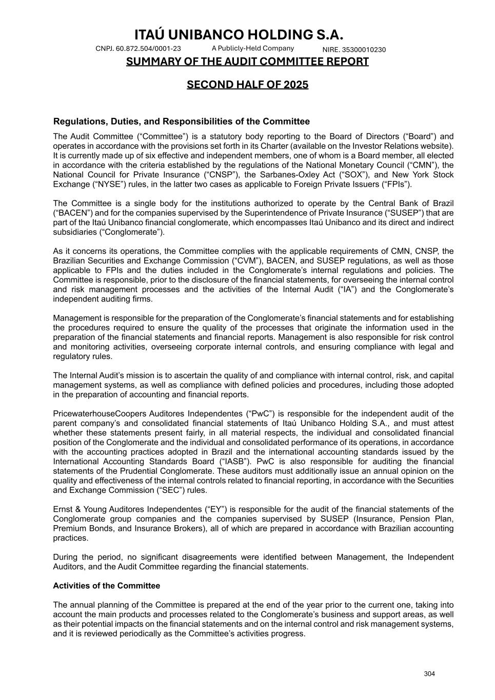ITAÚ UNIBANCO HOLDING S.A. NIRE. 35300010230 A Publicly-Held Company CNPJ. 60.872.504/0001-23 SUMMARY OF THE AUDIT COMMITTEE REPORT SECOND HALF OF 2025 Regulations, Duties, and Responsibilities of the Committee The Audit Committee (“Committee”) is a statutory body reporting to the Board of Directors (“Board”) and operates in accordance with the provisions set forth in its Charter (available on the Investor Relations website). It is currently made up of six effective and independent members, one of whom is a Board member, all elected in accordance with the criteria established by the regulations of the National Monetary Council (“CMN”), the National Council for Private Insurance (“CNSP”), the Sarbanes-Oxley Act (“SOX”), and New York Stock Exchange (“NYSE”) rules, in the latter two cases as applicable to Foreign Private Issuers (“FPIs”). The Committee is a single body for the institutions authorized to operate by the Central Bank of Brazil (“BACEN”) and for the companies supervised by the Superintendence of Private Insurance (“SUSEP”) that are part of the Itaú Unibanco financial conglomerate, which encompasses Itaú Unibanco and its direct and indirect subsidiaries (“Conglomerate”). As it concerns its operations, the Committee complies with the applicable requirements of CMN, CNSP, the Brazilian Securities and Exchange Commission (“CVM”), BACEN, and SUSEP regulations, as well as those applicable to FPIs and the duties included in the Conglomerate’s internal regulations and policies. The Committee is responsible, prior to the disclosure of the financial statements, for overseeing the internal control and risk management processes and the activities of the Internal Audit (“IA”) and the Conglomerate’s independent auditing firms. Management is responsible for the preparation of the Conglomerate’s financial statements and for establishing the procedures required to ensure the quality of the processes that originate the information used in the preparation of the financial statements and financial reports. Management is also responsible for risk control and monitoring activities, overseeing corporate internal controls, and ensuring compliance with legal and regulatory rules. The Internal Audit’s mission is to ascertain the quality of and compliance with internal control, risk, and capital management systems, as well as compliance with defined policies and procedures, including those adopted in the preparation of accounting and financial reports. PricewaterhouseCoopers Auditores Independentes (“PwC”) is responsible for the independent audit of the parent company’s and consolidated financial statements of Itaú Unibanco Holding S.A., and must attest whether these statements present fairly, in all material respects, the individual and consolidated financial position of the Conglomerate and the individual and consolidated performance of its operations, in accordance with the accounting practices adopted in Brazil and the international accounting standards issued by the International Accounting Standards Board (“IASB”). PwC is also responsible for auditing the financial statements of the Prudential Conglomerate. These auditors must additionally issue an annual opinion on the quality and effectiveness of the internal controls related to financial reporting, in accordance with the Securities and Exchange Commission (“SEC”) rules. Ernst & Young Auditores Independentes (“EY”) is responsible for the audit of the financial statements of the Conglomerate group companies and the companies supervised by SUSEP (Insurance, Pension Plan, Premium Bonds, and Insurance Brokers), all of which are prepared in accordance with Brazilian accounting practices. During the period, no significant disagreements were identified between Management, the Independent Auditors, and the Audit Committee regarding the financial statements. Activities of the Committee The annual planning of the Committee is prepared at the end of the year prior to the current one, taking into account the main products and processes related to the Conglomerate’s business and support areas, as well as their potential impacts on the financial statements and on the internal control and risk management systems, and it is reviewed periodically as the Committee’s activities progress. 304