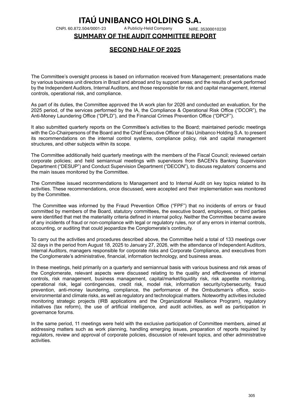 ITAÚ UNIBANCO HOLDING S.A. NIRE. 35300010230 A Publicly-Held Company CNPJ. 60.872.504/0001-23 SUMMARY OF THE AUDIT COMMITTEE REPORT SECOND HALF OF 2025 The Committee’s oversight process is based on information received from Management; presentations made by various business unit directors in Brazil and abroad and by support areas; and the results of work performed by the Independent Auditors, Internal Auditors, and those responsible for risk and capital management, internal controls, operational risk, and compliance. As part of its duties, the Committee approved the IA work plan for 2026 and conducted an evaluation, for the 2025 period, of the services performed by the IA, the Compliance & Operational Risk Office (“DCOR”), the Anti-Money Laundering Office (“DPLD”), and the Financial Crimes Prevention Office (“DPCF”). It also submitted quarterly reports on the Committee’s activities to the Board; maintained periodic meetings with the Co-Chairpersons of the Board and the Chief Executive Officer of Itaú Unibanco Holding S.A. to present its recommendations on the internal control systems, compliance policy, risk and capital management structures, and other subjects within its scope. The Committee additionally held quarterly meetings with the members of the Fiscal Council; reviewed certain corporate policies; and held semiannual meetings with supervisors from BACEN’s Banking Supervision Department (“DESUP”) and Conduct Supervision Department (“DECON”), to discuss regulators’ concerns and the main issues monitored by the Committee. The Committee issued recommendations to Management and to Internal Audit on key topics related to its activities. These recommendations, once discussed, were accepted and their implementation was monitored by the Committee. The Committee was informed by the Fraud Prevention Office (“FPF”) that no incidents of errors or fraud committed by members of the Board, statutory committees, the executive board, employees, or third parties were identified that met the materiality criteria defined in internal policy. Neither the Committee became aware of any incidents of fraud or non-compliance with legal or regulatory rules, nor of any errors in internal controls, accounting, or auditing that could jeopardize the Conglomerate’s continuity. To carry out the activities and procedures described above, the Committee held a total of 133 meetings over 32 days in the period from August 18, 2025 to January 27, 2026, with the attendance of Independent Auditors, Internal Auditors, managers responsible for corporate risks and Corporate Compliance, and executives from the Conglomerate’s administrative, financial, information technology, and business areas. In these meetings, held primarily on a quarterly and semiannual basis with various business and risk areas of the Conglomerate, relevant aspects were discussed relating to the quality and effectiveness of internal controls, risk management, business management, capital/market/liquidity risk, risk appetite monitoring, operational risk, legal contingencies, credit risk, model risk, information security/cybersecurity, fraud prevention, anti-money laundering, compliance, the performance of the Ombudsman’s office, socio- environmental and climate risks, as well as regulatory and technological matters. Noteworthy activities included monitoring strategic projects (IRB applications and the Organizational Resilience Program), regulatory initiatives (tax reform), the use of artificial intelligence, and audit activities, as well as participation in governance forums. In the same period, 11 meetings were held with the exclusive participation of Committee members, aimed at addressing matters such as work planning, handling emerging issues, preparation of reports required by regulators, review and approval of corporate policies, discussion of relevant topics, and other administrative activities. 305