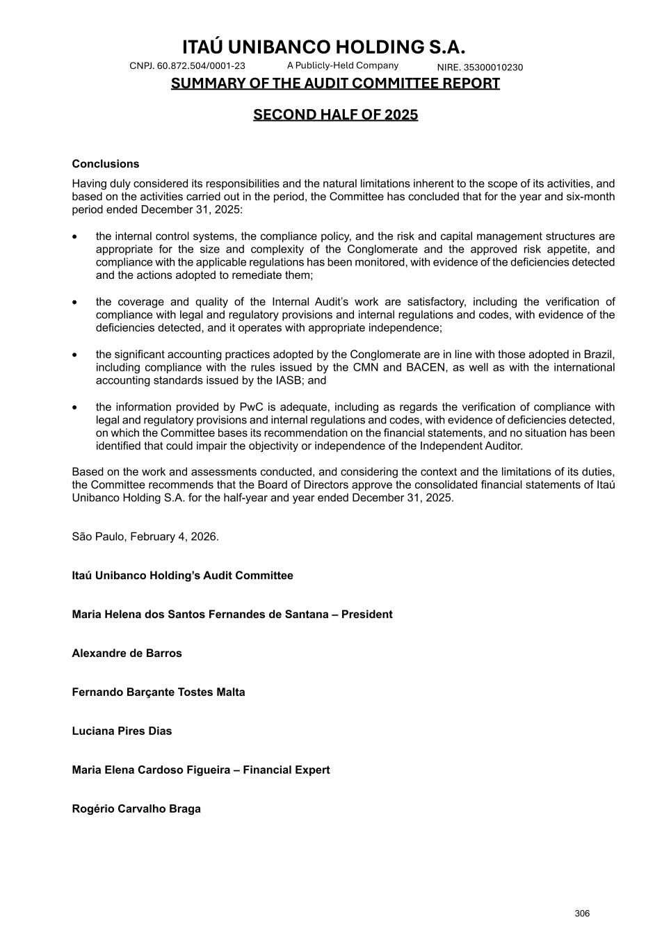 ITAÚ UNIBANCO HOLDING S.A. NIRE. 35300010230 A Publicly-Held Company CNPJ. 60.872.504/0001-23 SUMMARY OF THE AUDIT COMMITTEE REPORT SECOND HALF OF 2025 Conclusions Having duly considered its responsibilities and the natural limitations inherent to the scope of its activities, and based on the activities carried out in the period, the Committee has concluded that for the year and six-month period ended December 31, 2025: • the internal control systems, the compliance policy, and the risk and capital management structures are appropriate for the size and complexity of the Conglomerate and the approved risk appetite, and compliance with the applicable regulations has been monitored, with evidence of the deficiencies detected and the actions adopted to remediate them; • the coverage and quality of the Internal Audit’s work are satisfactory, including the verification of compliance with legal and regulatory provisions and internal regulations and codes, with evidence of the deficiencies detected, and it operates with appropriate independence; • the significant accounting practices adopted by the Conglomerate are in line with those adopted in Brazil, including compliance with the rules issued by the CMN and BACEN, as well as with the international accounting standards issued by the IASB; and • the information provided by PwC is adequate, including as regards the verification of compliance with legal and regulatory provisions and internal regulations and codes, with evidence of deficiencies detected, on which the Committee bases its recommendation on the financial statements, and no situation has been identified that could impair the objectivity or independence of the Independent Auditor. Based on the work and assessments conducted, and considering the context and the limitations of its duties, the Committee recommends that the Board of Directors approve the consolidated financial statements of Itaú Unibanco Holding S.A. for the half-year and year ended December 31, 2025. São Paulo, February 4, 2026. Itaú Unibanco Holding’s Audit Committee Maria Helena dos Santos Fernandes de Santana – President Alexandre de Barros Fernando Barçante Tostes Malta Luciana Pires Dias Maria Elena Cardoso Figueira – Financial Expert Rogério Carvalho Braga 306