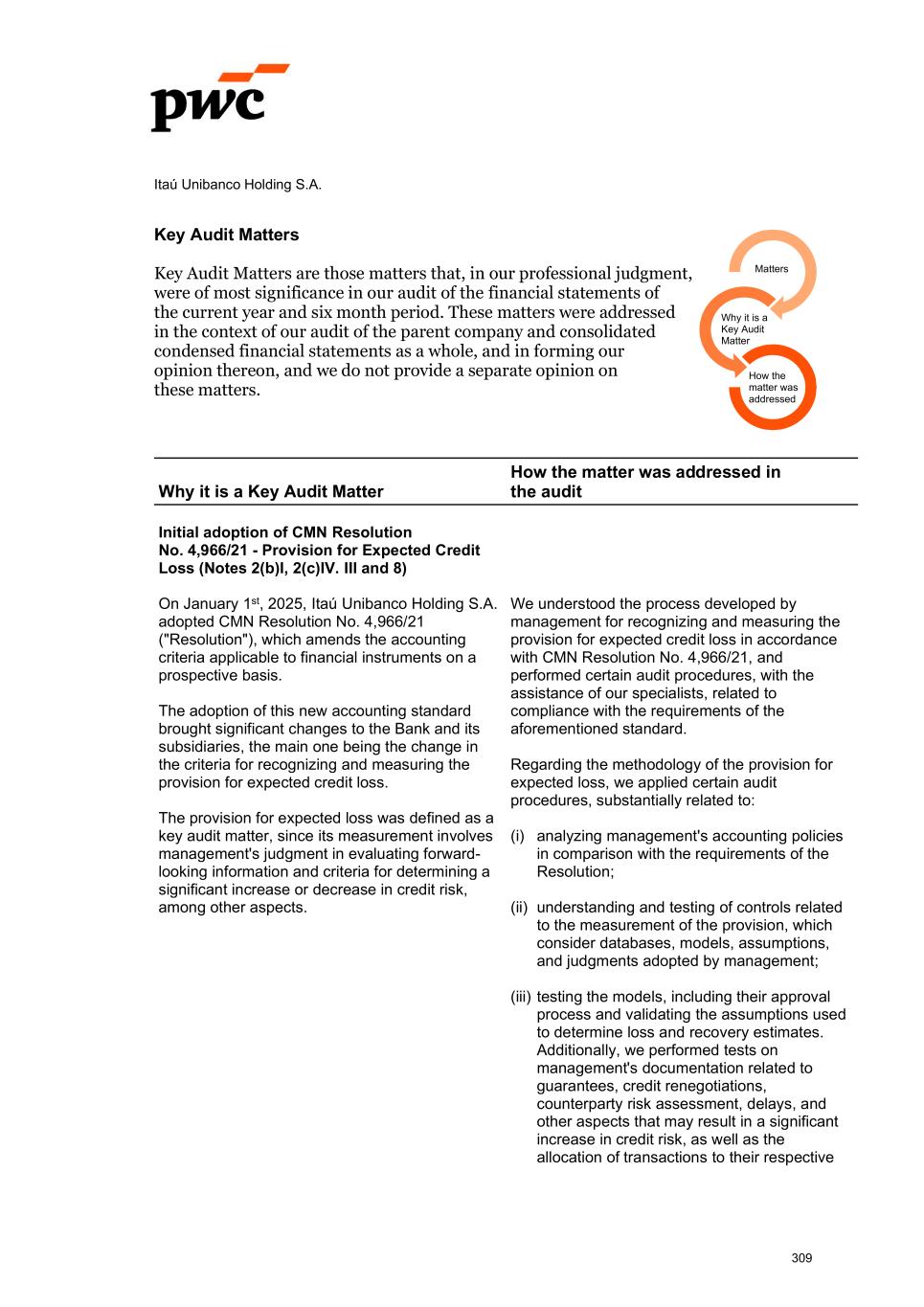 Itaú Unibanco Holding S.A. Key Audit Matters Key Audit Matters are those matters that, in our professional judgment, were of most significance in our audit of the financial statements of the current year and six month period. These matters were addressed in the context of our audit of the parent company and consolidated condensed financial statements as a whole, and in forming our opinion thereon, and we do not provide a separate opinion on these matters. Why it is a Key Audit Matter How the matter was addressed in the audit Initial adoption of CMN Resolution No. 4,966/21 - Provision for Expected Credit Loss (Notes 2(b)I, 2(c)IV. III and 8) On January 1st, 2025, Itaú Unibanco Holding S.A. adopted CMN Resolution No. 4,966/21 ("Resolution"), which amends the accounting criteria applicable to financial instruments on a prospective basis. The adoption of this new accounting standard brought significant changes to the Bank and its subsidiaries, the main one being the change in the criteria for recognizing and measuring the provision for expected credit loss. The provision for expected loss was defined as a key audit matter, since its measurement involves management's judgment in evaluating forward- looking information and criteria for determining a significant increase or decrease in credit risk, among other aspects. We understood the process developed by management for recognizing and measuring the provision for expected credit loss in accordance with CMN Resolution No. 4,966/21, and performed certain audit procedures, with the assistance of our specialists, related to compliance with the requirements of the aforementioned standard. Regarding the methodology of the provision for expected loss, we applied certain audit procedures, substantially related to: (i) analyzing management's accounting policies in comparison with the requirements of the Resolution; (ii) understanding and testing of controls related to the measurement of the provision, which consider databases, models, assumptions, and judgments adopted by management; (iii) testing the models, including their approval process and validating the assumptions used to determine loss and recovery estimates. Additionally, we performed tests on management's documentation related to guarantees, credit renegotiations, counterparty risk assessment, delays, and other aspects that may result in a significant increase in credit risk, as well as the allocation of transactions to their respective Matters Why it is a Key Audit Matter How the matter was addressed 309