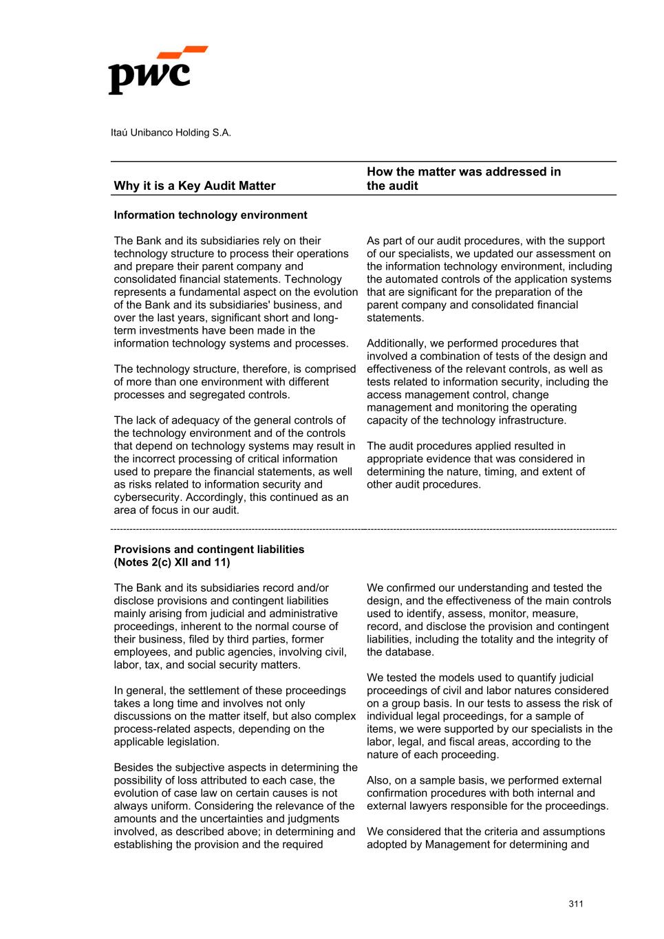 Itaú Unibanco Holding S.A. Why it is a Key Audit Matter How the matter was addressed in the audit Information technology environment The Bank and its subsidiaries rely on their technology structure to process their operations and prepare their parent company and consolidated financial statements. Technology represents a fundamental aspect on the evolution of the Bank and its subsidiaries' business, and over the last years, significant short and long- term investments have been made in the information technology systems and processes. The technology structure, therefore, is comprised of more than one environment with different processes and segregated controls. The lack of adequacy of the general controls of the technology environment and of the controls that depend on technology systems may result in the incorrect processing of critical information used to prepare the financial statements, as well as risks related to information security and cybersecurity. Accordingly, this continued as an area of focus in our audit. As part of our audit procedures, with the support of our specialists, we updated our assessment on the information technology environment, including the automated controls of the application systems that are significant for the preparation of the parent company and consolidated financial statements. Additionally, we performed procedures that involved a combination of tests of the design and effectiveness of the relevant controls, as well as tests related to information security, including the access management control, change management and monitoring the operating capacity of the technology infrastructure. The audit procedures applied resulted in appropriate evidence that was considered in determining the nature, timing, and extent of other audit procedures. Provisions and contingent liabilities (Notes 2(c) XII and 11) The Bank and its subsidiaries record and/or disclose provisions and contingent liabilities mainly arising from judicial and administrative proceedings, inherent to the normal course of their business, filed by third parties, former employees, and public agencies, involving civil, labor, tax, and social security matters. In general, the settlement of these proceedings takes a long time and involves not only discussions on the matter itself, but also complex process-related aspects, depending on the applicable legislation. Besides the subjective aspects in determining the possibility of loss attributed to each case, the evolution of case law on certain causes is not always uniform. Considering the relevance of the amounts and the uncertainties and judgments involved, as described above; in determining and establishing the provision and the required We confirmed our understanding and tested the design, and the effectiveness of the main controls used to identify, assess, monitor, measure, record, and disclose the provision and contingent liabilities, including the totality and the integrity of the database. We tested the models used to quantify judicial proceedings of civil and labor natures considered on a group basis. In our tests to assess the risk of individual legal proceedings, for a sample of items, we were supported by our specialists in the labor, legal, and fiscal areas, according to the nature of each proceeding. Also, on a sample basis, we performed external confirmation procedures with both internal and external lawyers responsible for the proceedings. We considered that the criteria and assumptions adopted by Management for determining and 311