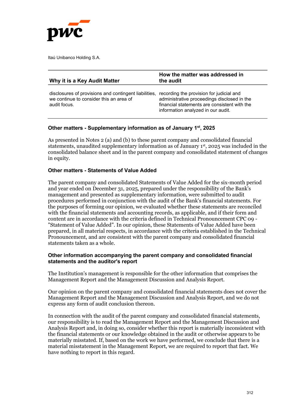 Itaú Unibanco Holding S.A. Why it is a Key Audit Matter How the matter was addressed in the audit disclosures of provisions and contingent liabilities, we continue to consider this an area of audit focus. recording the provision for judicial and administrative proceedings disclosed in the financial statements are consistent with the information analyzed in our audit. Other matters - Supplementary information as of January 1st, 2025 As presented in Notes 2 (a) and (b) to these parent company and consolidated financial statements, unaudited supplementary information as of January 1st, 2025 was included in the consolidated balance sheet and in the parent company and consolidated statement of changes in equity. Other matters - Statements of Value Added The parent company and consolidated Statements of Value Added for the six-month period and year ended on December 31, 2025, prepared under the responsibility of the Bank's management and presented as supplementary information, were submitted to audit procedures performed in conjunction with the audit of the Bank's financial statements. For the purposes of forming our opinion, we evaluated whether these statements are reconciled with the financial statements and accounting records, as applicable, and if their form and content are in accordance with the criteria defined in Technical Pronouncement CPC 09 - "Statement of Value Added". In our opinion, these Statements of Value Added have been prepared, in all material respects, in accordance with the criteria established in the Technical Pronouncement, and are consistent with the parent company and consolidated financial statements taken as a whole. Other information accompanying the parent company and consolidated financial statements and the auditor's report The Institution's management is responsible for the other information that comprises the Management Report and the Management Discussion and Analysis Report. Our opinion on the parent company and consolidated financial statements does not cover the Management Report and the Management Discussion and Analysis Report, and we do not express any form of audit conclusion thereon. In connection with the audit of the parent company and consolidated financial statements, our responsibility is to read the Management Report and the Management Discussion and Analysis Report and, in doing so, consider whether this report is materially inconsistent with the financial statements or our knowledge obtained in the audit or otherwise appears to be materially misstated. If, based on the work we have performed, we conclude that there is a material misstatement in the Management Report, we are required to report that fact. We have nothing to report in this regard. 312