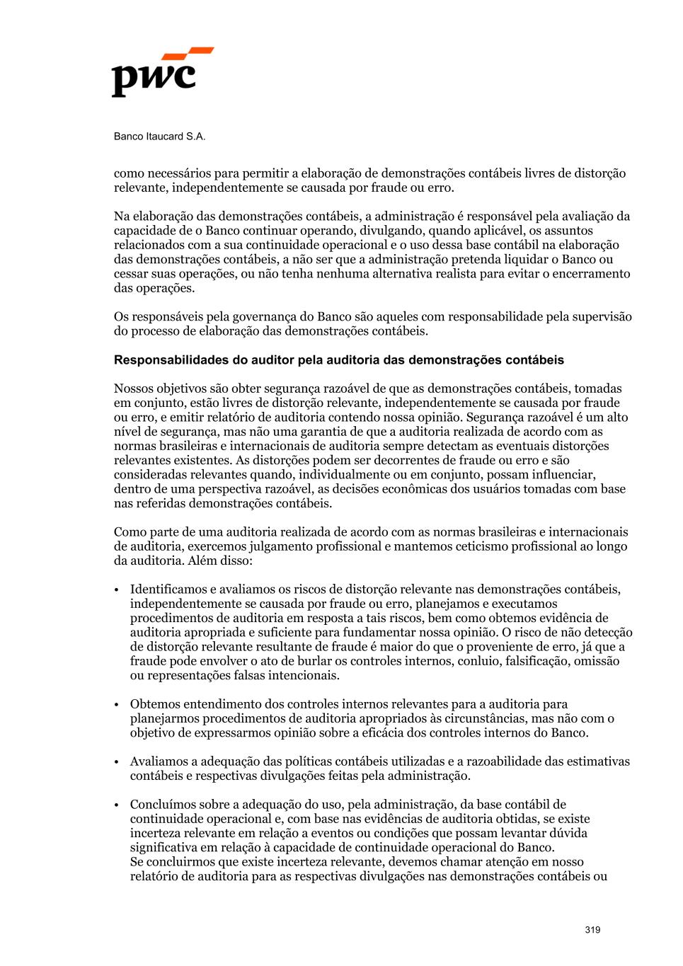 Banco Itaucard S.A. como necessários para permitir a elaboração de demonstrações contábeis livres de distorção relevante, independentemente se causada por fraude ou erro. Na elaboração das demonstrações contábeis, a administração é responsável pela avaliação da capacidade de o Banco continuar operando, divulgando, quando aplicável, os assuntos relacionados com a sua continuidade operacional e o uso dessa base contábil na elaboração das demonstrações contábeis, a não ser que a administração pretenda liquidar o Banco ou cessar suas operações, ou não tenha nenhuma alternativa realista para evitar o encerramento das operações. Os responsáveis pela governança do Banco são aqueles com responsabilidade pela supervisão do processo de elaboração das demonstrações contábeis. Responsabilidades do auditor pela auditoria das demonstrações contábeis Nossos objetivos são obter segurança razoável de que as demonstrações contábeis, tomadas em conjunto, estão livres de distorção relevante, independentemente se causada por fraude ou erro, e emitir relatório de auditoria contendo nossa opinião. Segurança razoável é um alto nível de segurança, mas não uma garantia de que a auditoria realizada de acordo com as normas brasileiras e internacionais de auditoria sempre detectam as eventuais distorções relevantes existentes. As distorções podem ser decorrentes de fraude ou erro e são consideradas relevantes quando, individualmente ou em conjunto, possam influenciar, dentro de uma perspectiva razoável, as decisões econômicas dos usuários tomadas com base nas referidas demonstrações contábeis. Como parte de uma auditoria realizada de acordo com as normas brasileiras e internacionais de auditoria, exercemos julgamento profissional e mantemos ceticismo profissional ao longo da auditoria. Além disso: • Identificamos e avaliamos os riscos de distorção relevante nas demonstrações contábeis, independentemente se causada por fraude ou erro, planejamos e executamos procedimentos de auditoria em resposta a tais riscos, bem como obtemos evidência de auditoria apropriada e suficiente para fundamentar nossa opinião. O risco de não detecção de distorção relevante resultante de fraude é maior do que o proveniente de erro, já que a fraude pode envolver o ato de burlar os controles internos, conluio, falsificação, omissão ou representações falsas intencionais. • Obtemos entendimento dos controles internos relevantes para a auditoria para planejarmos procedimentos de auditoria apropriados às circunstâncias, mas não com o objetivo de expressarmos opinião sobre a eficácia dos controles internos do Banco. • Avaliamos a adequação das políticas contábeis utilizadas e a razoabilidade das estimativas contábeis e respectivas divulgações feitas pela administração. • Concluímos sobre a adequação do uso, pela administração, da base contábil de continuidade operacional e, com base nas evidências de auditoria obtidas, se existe incerteza relevante em relação a eventos ou condições que possam levantar dúvida significativa em relação à capacidade de continuidade operacional do Banco. Se concluirmos que existe incerteza relevante, devemos chamar atenção em nosso relatório de auditoria para as respectivas divulgações nas demonstrações contábeis ou 319