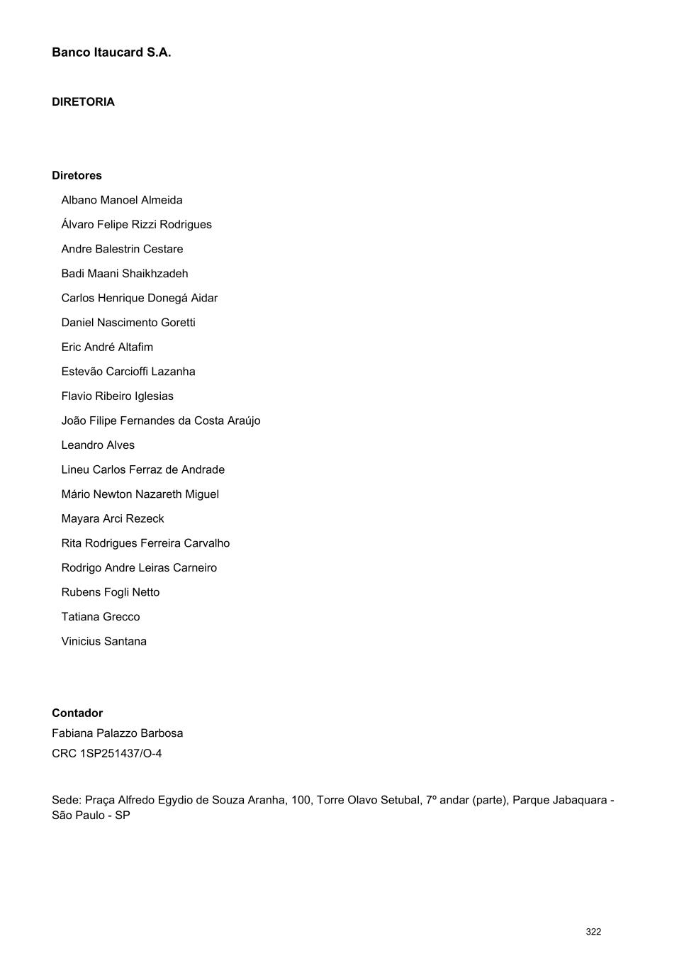 Banco Itaucard S.A. DIRETORIA Diretores Albano Manoel Almeida Álvaro Felipe Rizzi Rodrigues Andre Balestrin Cestare Badi Maani Shaikhzadeh Carlos Henrique Donegá Aidar Daniel Nascimento Goretti Eric André Altafim Estevão Carcioffi Lazanha Flavio Ribeiro Iglesias João Filipe Fernandes da Costa Araújo Leandro Alves Lineu Carlos Ferraz de Andrade Mário Newton Nazareth Miguel Mayara Arci Rezeck Rita Rodrigues Ferreira Carvalho Rodrigo Andre Leiras Carneiro Rubens Fogli Netto Tatiana Grecco Vinicius Santana Contador Fabiana Palazzo Barbosa CRC 1SP251437/O-4 Sede: Praça Alfredo Egydio de Souza Aranha, 100, Torre Olavo Setubal, 7º andar (parte), Parque Jabaquara - São Paulo - SP 322