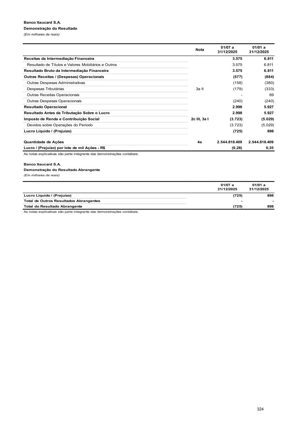 Banco Itaucard S.A. Demonstração do Resultado (Em milhares de reais) 1 Nota 01/07 a 31/12/2025 01/01 a 31/12/2025 Receitas da Intermediação Financeira 3.575 6.811 Resultado de Títulos e Valores Mobiliários e Outros 3.575 6.811 Resultado Bruto da Intermediação Financeira 3.575 6.811 Outras Receitas / (Despesas) Operacionais (577) (884) Outras Despesas Administrativas (158) (380) Despesas Tributárias 3a II (179) (333) Outras Receitas Operacionais - 69 Outras Despesas Operacionais (240) (240) Resultado Operacional 2.998 5.927 Resultado Antes da Tributação Sobre o Lucro 2.998 5.927 Imposto de Renda e Contribuição Social 2c III, 3a I (3.723) (5.029) Devidos sobre Operações do Período (3.723) (5.029) Lucro Líquido / (Prejuízo) (725) 898 Quantidade de Ações 4a 2.544.818.409 2.544.818.409 Lucro / (Prejuízo) por lote de mil Ações - R$ (0,28) 0,35 As notas explicativas são parte integrante das demonstrações contábeis. Banco Itaucard S.A. Demonstração do Resultado Abrangente (Em milhares de reais) 1 01/07 a 31/12/2025 01/01 a 31/12/2025 Lucro Líquido / (Prejuízo) (725) 898 Total de Outros Resultados Abrangentes 1 - - Total do Resultado Abrangente (725) 898 As notas explicativas são parte integrante das demonstrações contábeis. 324