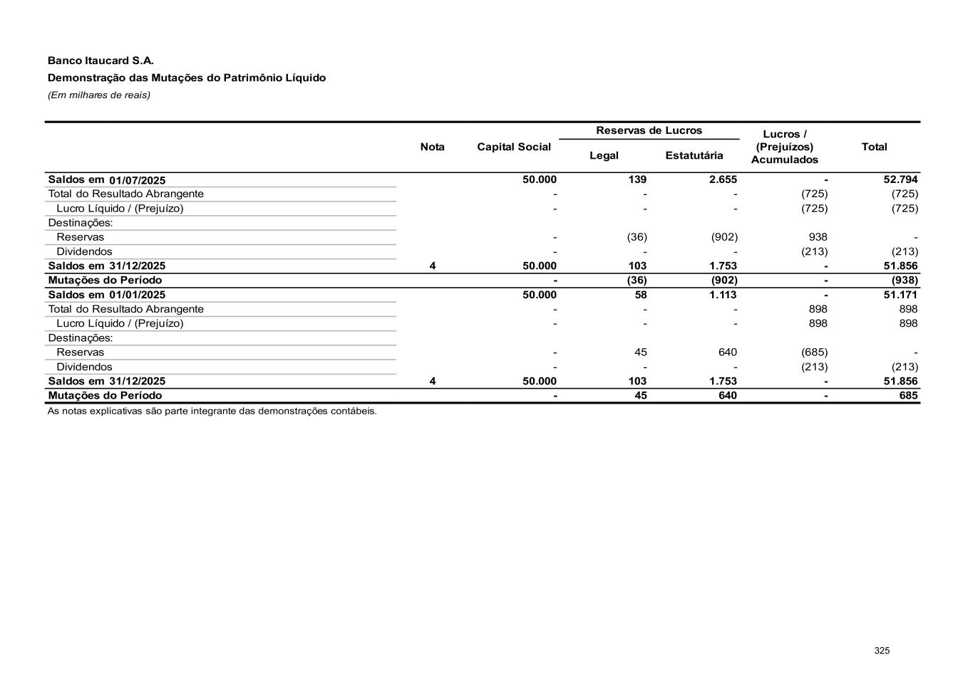 Banco Itaucard S.A. Demonstração das Mutações do Patrimônio Líquido (Em milhares de reais) Nota Capital Social Reservas de Lucros Lucros / (Prejuízos) Acumulados Total Legal Estatutária Saldos em 01/07/2025 50.000 139 2.655 - 52.794 Total do Resultado Abrangente - - - (725) (725) Lucro Líquido / (Prejuízo) - - - (725) (725) Destinações: Reservas - (36) (902) 938 - Dividendos - - - (213) (213) Saldos em 31/12/2025 4 50.000 103 1.753 - 51.856 Mutações do Período - (36) (902) - (938) Saldos em 01/01/2025 50.000 58 1.113 - 51.171 Total do Resultado Abrangente - - - 898 898 Lucro Líquido / (Prejuízo) - - - 898 898 Destinações: Reservas - 45 640 (685) - Dividendos - - - (213) (213) Saldos em 31/12/2025 4 50.000 103 1.753 - 51.856 Mutações do Período - 45 640 - 685 As notas explicativas são parte integrante das demonstrações contábeis. 325