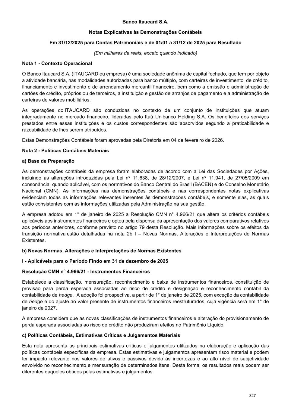 Banco Itaucard S.A. Notas Explicativas às Demonstrações Contábeis Em 31/12/2025 para Contas Patrimoniais e de 01/01 a 31/12 de 2025 para Resultado (Em milhares de reais, exceto quando indicado) Nota 1 - Contexto Operacional O Banco Itaucard S.A. (ITAUCARD ou empresa) é uma sociedade anônima de capital fechado, que tem por objeto a atividade bancária, nas modalidades autorizadas para banco múltiplo, com carteiras de investimento, de crédito, financiamento e investimento e de arrendamento mercantil financeiro, bem como a emissão e administração de cartões de crédito, próprios ou de terceiros, a instituição e gestão de arranjos de pagamento e a administração de carteiras de valores mobiliários. As operações do ITAUCARD são conduzidas no contexto de um conjunto de instituições que atuam integradamente no mercado financeiro, lideradas pelo Itaú Unibanco Holding S.A. Os benefícios dos serviços prestados entre essas instituições e os custos correspondentes são absorvidos segundo a praticabilidade e razoabilidade de lhes serem atribuídos. Estas Demonstrações Contábeis foram aprovadas pela Diretoria em 04 de fevereiro de 2026. Nota 2 - Políticas Contábeis Materiais a) Base de Preparação As demonstrações contábeis da empresa foram elaboradas de acordo com a Lei das Sociedades por Ações, incluindo as alterações introduzidas pela Lei nº 11.638, de 28/12/2007, e Lei nº 11.941, de 27/05/2009 em consonância, quando aplicável, com os normativos do Banco Central do Brasil (BACEN) e do Conselho Monetário Nacional (CMN). As informações nas demonstrações contábeis e nas correspondentes notas explicativas evidenciam todas as informações relevantes inerentes às demonstrações contábeis, e somente elas, as quais estão consistentes com as informações utilizadas pela Administração na sua gestão. A empresa adotou em 1° de janeiro de 2025 a Resolução CMN n° 4.966/21 que altera os critérios contábeis aplicáveis aos instrumentos financeiros e optou pela dispensa da apresentação dos valores comparativos relativos aos períodos anteriores, conforme previsto no artigo 79 desta Resolução. Mais informações sobre os efeitos da transição normativa estão detalhadas na nota 2b I – Novas Normas, Alterações e Interpretações de Normas Existentes. b) Novas Normas, Alterações e Interpretações de Normas Existentes I - Aplicáveis para o Período Findo em 31 de dezembro de 2025 Resolução CMN n° 4.966/21 - Instrumentos Financeiros Estabelece a classificação, mensuração, reconhecimento e baixa de instrumentos financeiros, constituição de provisão para perda esperada associadas ao risco de crédito e designação e reconhecimento contábil da contabilidade de hedge. A adoção foi prospectiva, a partir de 1° de janeiro de 2025, com exceção da contabilidade de hedge e do ajuste ao valor presente de instrumentos financeiros reestruturados, cuja vigência será em 1° de janeiro de 2027. A empresa considera que as novas classificações de instrumentos financeiros e alteração do provisionamento de perda esperada associadas ao risco de crédito não produziram efeitos no Patrimônio Líquido. c) Políticas Contábeis, Estimativas Críticas e Julgamentos Materiais Esta nota apresenta as principais estimativas críticas e julgamentos utilizados na elaboração e aplicação das políticas contábeis específicas da empresa. Estas estimativas e julgamentos apresentam risco material e podem ter impacto relevante nos valores de ativos e passivos devido às incertezas e ao alto nível de subjetividade envolvido no reconhecimento e mensuração de determinados itens. Desta forma, os resultados reais podem ser diferentes daqueles obtidos pelas estimativas e julgamentos. 327