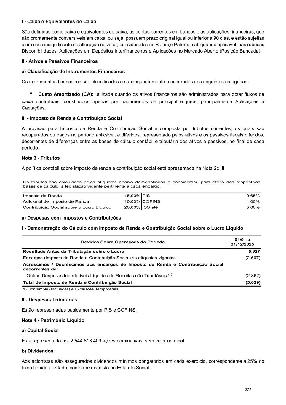 I - Caixa e Equivalentes de Caixa São definidas como caixa e equivalentes de caixa, as contas correntes em bancos e as aplicações financeiras, que são prontamente conversíveis em caixa, ou seja, possuem prazo original igual ou inferior a 90 dias, e estão sujeitas a um risco insignificante de alteração no valor, consideradas no Balanço Patrimonial, quando aplicável, nas rubricas Disponibilidades, Aplicações em Depósitos Interfinanceiros e Aplicações no Mercado Aberto (Posição Bancada). II - Ativos e Passivos Financeiros a) Classificação de Instrumentos Financeiros Os instrumentos financeiros são classificados e subsequentemente mensurados nas seguintes categorias: • Custo Amortizado (CA): utilizada quando os ativos financeiros são administrados para obter fluxos de caixa contratuais, constituídos apenas por pagamentos de principal e juros, principalmente Aplicações e Captações. III - Imposto de Renda e Contribuição Social A provisão para Imposto de Renda e Contribuição Social é composta por tributos correntes, os quais são recuperados ou pagos no período aplicável, e diferidos, representado pelos ativos e os passivos fiscais diferidos, decorrentes de diferenças entre as bases de cálculo contábil e tributária dos ativos e passivos, no final de cada período. Nota 3 - Tributos A política contábil sobre imposto de renda e contribuição social está apresentada na Nota 2c III. Os tributos são calculados pelas alíquotas abaixo demonstradas e consideram, para efeito das respectivas bases de cálculo, a legislação vigente pertinente a cada encargo. Imposto de Renda 15,00% PIS 0,65% Adicional de Imposto de Renda 10,00% COFINS 4,00% Contribuição Social sobre o Lucro Líquido 20,00% ISS até 5,00% a) Despesas com Impostos e Contribuições I - Demonstração do Cálculo com Imposto de Renda e Contribuição Social sobre o Lucro Líquido Devidos Sobre Operações do Período 01/01 a 31/12/2025 Resultado Antes da Tributação sobre o Lucro 5.927 Encargos (Imposto de Renda e Contribuição Social) às alíquotas vigentes (2.667) Acréscimos / Decréscimos aos encargos de Imposto de Renda e Contribuição Social decorrentes de: Outras Despesas Indedutíveis Líquidas de Receitas não Tributáveis (1) (2.362) Total de Imposto de Renda e Contribuição Social (5.029) 1) Contempla (Inclusões) e Exclusões Temporárias. II - Despesas Tributárias Estão representadas basicamente por PIS e COFINS. Nota 4 - Patrimônio Líquido a) Capital Social Está representado por 2.544.818.409 ações nominativas, sem valor nominal. b) Dividendos Aos acionistas são assegurados dividendos mínimos obrigatórios em cada exercício, correspondente a 25% do lucro líquido ajustado, conforme disposto no Estatuto Social. 328