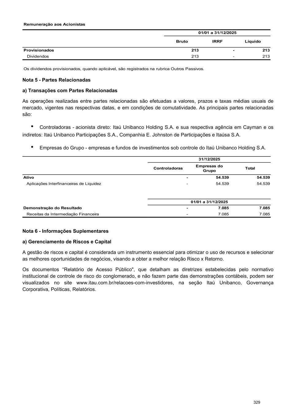 Remuneração aos Acionistas 01/01 a 31/12/2025 Bruto IRRF Líquido Provisionados 213 - 213 Dividendos 213 - 213 Os dividendos provisionados, quando aplicável, são registrados na rubrica Outros Passivos. Nota 5 - Partes Relacionadas a) Transações com Partes Relacionadas As operações realizadas entre partes relacionadas são efetuadas a valores, prazos e taxas médias usuais de mercado, vigentes nas respectivas datas, e em condições de comutatividade. As principais partes relacionadas são: • Controladoras - acionista direto: Itaú Unibanco Holding S.A. e sua respectiva agência em Cayman e os indiretos: Itaú Unibanco Participações S.A., Companhia E. Johnston de Participações e Itaúsa S.A. • Empresas do Grupo - empresas e fundos de investimentos sob controle do Itaú Unibanco Holding S.A. 31/12/2025 Controladoras Empresas do Grupo Total Ativo - 54.539 54.539 Aplicações Interfinanceiras de Liquidez - 54.539 54.539 01/01 a 31/12/2025 Demonstração do Resultado - 7.085 7.085 Receitas da Intermediação Financeira - 7.085 7.085 Nota 6 - Informações Suplementares a) Gerenciamento de Riscos e Capital A gestão de riscos e capital é considerada um instrumento essencial para otimizar o uso de recursos e selecionar as melhores oportunidades de negócios, visando a obter a melhor relação Risco x Retorno. Os documentos “Relatório de Acesso Público", que detalham as diretrizes estabelecidas pelo normativo institucional de controle de risco do conglomerado, e não fazem parte das demonstrações contábeis, podem ser visualizados no site www.itau.com.br/relacoes-com-investidores, na seção Itaú Unibanco, Governança Corporativa, Políticas, Relatórios. 329