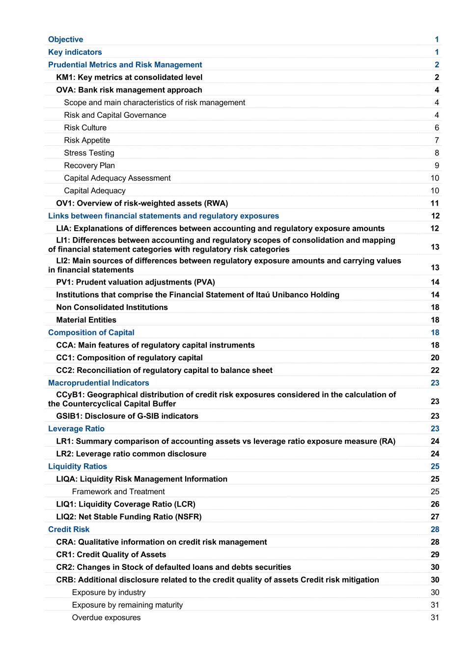 Objective 1 Key indicators 1 Prudential Metrics and Risk Management 2 KM1: Key metrics at consolidated level 2 OVA: Bank risk management approach 4 Scope and main characteristics of risk management 4 Risk and Capital Governance 4 Risk Culture 6 Risk Appetite 7 Stress Testing 8 Recovery Plan 9 Capital Adequacy Assessment 10 Capital Adequacy 10 OV1: Overview of risk-weighted assets (RWA) 11 Links between financial statements and regulatory exposures 12 LIA: Explanations of differences between accounting and regulatory exposure amounts 12 LI1: Differences between accounting and regulatory scopes of consolidation and mapping of financial statement categories with regulatory risk categories 13 LI2: Main sources of differences between regulatory exposure amounts and carrying values in financial statements 13 PV1: Prudent valuation adjustments (PVA) 14 Institutions that comprise the Financial Statement of Itaú Unibanco Holding 14 Non Consolidated Institutions 18 Material Entities 18 Composition of Capital 18 CCA: Main features of regulatory capital instruments 18 CC1: Composition of regulatory capital 20 CC2: Reconciliation of regulatory capital to balance sheet 22 Macroprudential Indicators 23 CCyB1: Geographical distribution of credit risk exposures considered in the calculation of the Countercyclical Capital Buffer 23 GSIB1: Disclosure of G-SIB indicators 23 Leverage Ratio 23 LR1: Summary comparison of accounting assets vs leverage ratio exposure measure (RA) 24 LR2: Leverage ratio common disclosure 24 Liquidity Ratios 25 LIQA: Liquidity Risk Management Information 25 Framework and Treatment 25 LIQ1: Liquidity Coverage Ratio (LCR) 26 LIQ2: Net Stable Funding Ratio (NSFR) 27 Credit Risk 28 CRA: Qualitative information on credit risk management 28 CR1: Credit Quality of Assets 29 CR2: Changes in Stock of defaulted loans and debts securities 30 CRB: Additional disclosure related to the credit quality of assets Credit risk mitigation 30 Exposure by industry 30 Exposure by remaining maturity 31 Overdue exposures 31