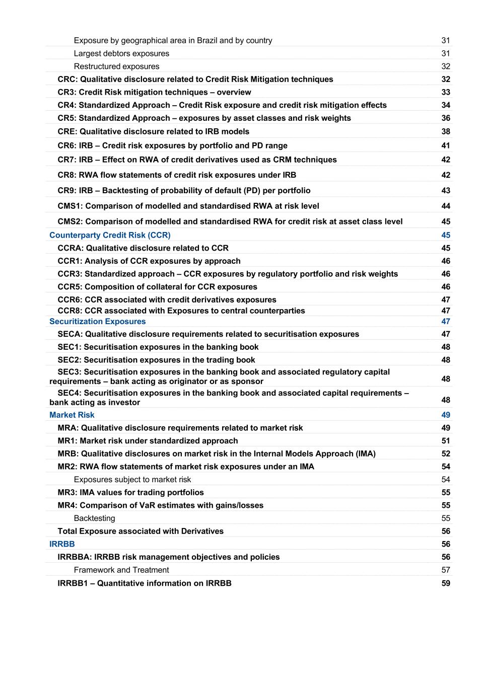 Exposure by geographical area in Brazil and by country 31 Largest debtors exposures 31 Restructured exposures 32 CRC: Qualitative disclosure related to Credit Risk Mitigation techniques 32 CR3: Credit Risk mitigation techniques – overview 33 CR4: Standardized Approach – Credit Risk exposure and credit risk mitigation effects 34 CR5: Standardized Approach – exposures by asset classes and risk weights 36 CRE: Qualitative disclosure related to IRB models 38 CR6: IRB – Credit risk exposures by portfolio and PD range 41 CR7: IRB – Effect on RWA of credit derivatives used as CRM techniques 42 CR8: RWA flow statements of credit risk exposures under IRB 42 CR9: IRB – Backtesting of probability of default (PD) per portfolio 43 CMS1: Comparison of modelled and standardised RWA at risk level 44 CMS2: Comparison of modelled and standardised RWA for credit risk at asset class level 45 Counterparty Credit Risk (CCR) 45 CCRA: Qualitative disclosure related to CCR 45 CCR1: Analysis of CCR exposures by approach 46 CCR3: Standardized approach – CCR exposures by regulatory portfolio and risk weights 46 CCR5: Composition of collateral for CCR exposures 46 CCR6: CCR associated with credit derivatives exposures 47 CCR8: CCR associated with Exposures to central counterparties 47 Securitization Exposures 47 SECA: Qualitative disclosure requirements related to securitisation exposures 47 SEC1: Securitisation exposures in the banking book 48 SEC2: Securitisation exposures in the trading book 48 SEC3: Securitisation exposures in the banking book and associated regulatory capital requirements – bank acting as originator or as sponsor 48 SEC4: Securitisation exposures in the banking book and associated capital requirements – bank acting as investor 48 Market Risk 49 MRA: Qualitative disclosure requirements related to market risk 49 MR1: Market risk under standardized approach 51 MRB: Qualitative disclosures on market risk in the Internal Models Approach (IMA) 52 MR2: RWA flow statements of market risk exposures under an IMA 54 Exposures subject to market risk 54 MR3: IMA values for trading portfolios 55 MR4: Comparison of VaR estimates with gains/losses 55 Backtesting 55 Total Exposure associated with Derivatives 56 IRRBB 56 IRRBBA: IRRBB risk management objectives and policies 56 Framework and Treatment 57 IRRBB1 – Quantitative information on IRRBB 59