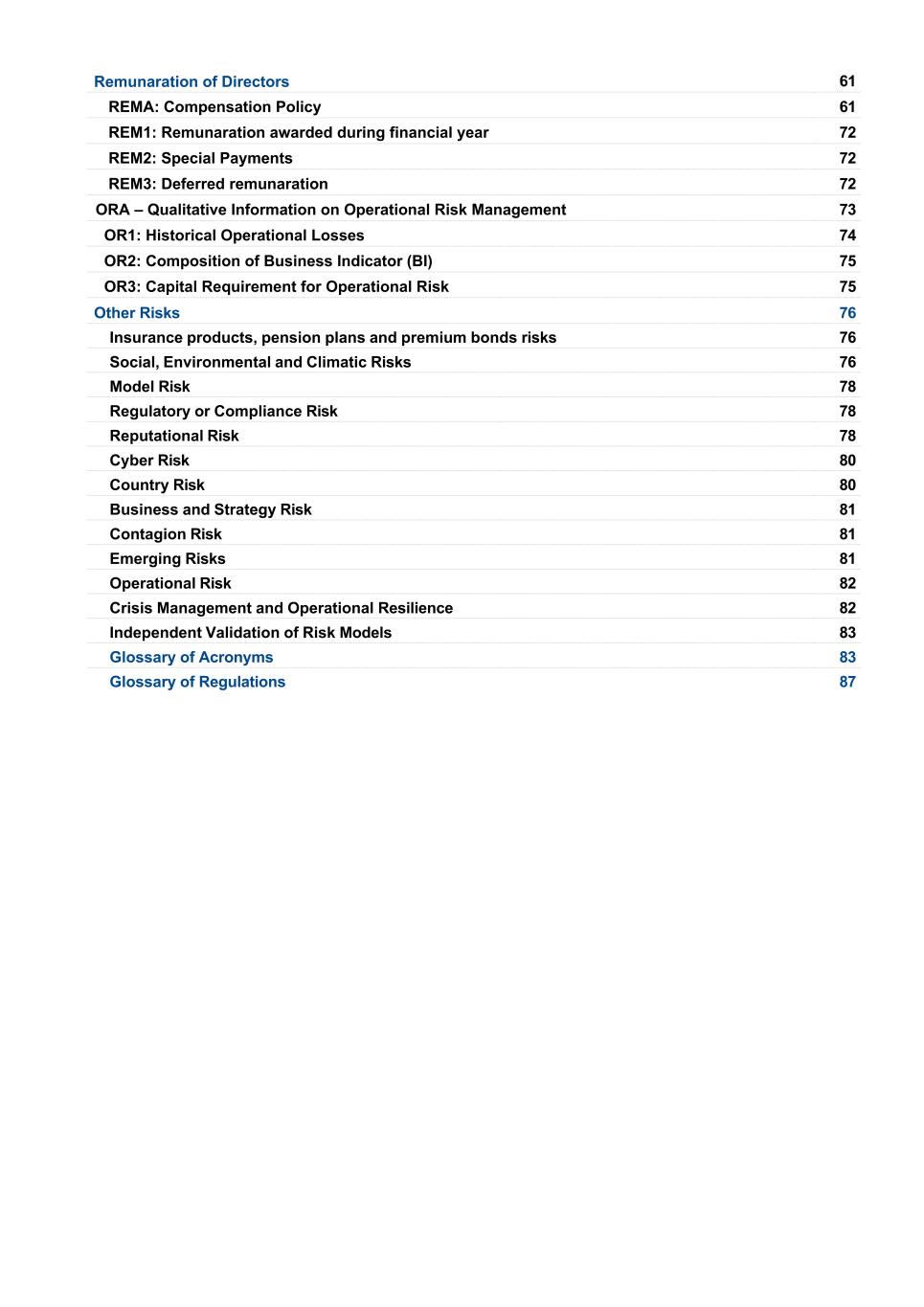 Remunaration of Directors 61 REMA: Compensation Policy 61 REM1: Remunaration awarded during financial year 72 REM2: Special Payments 72 REM3: Deferred remunaration 72 ORA – Qualitative Information on Operational Risk Management 73 OR1: Historical Operational Losses 74 OR2: Composition of Business Indicator (BI) 75 OR3: Capital Requirement for Operational Risk 75 Other Risks 76 Insurance products, pension plans and premium bonds risks 76 Social, Environmental and Climatic Risks 76 Model Risk 78 Regulatory or Compliance Risk 78 Reputational Risk 78 Cyber Risk 80 Country Risk 80 Business and Strategy Risk 81 Contagion Risk 81 Emerging Risks 81 Operational Risk 82 Crisis Management and Operational Resilience 82 Independent Validation of Risk Models 83 Glossary of Acronyms 83 Glossary of Regulations 87