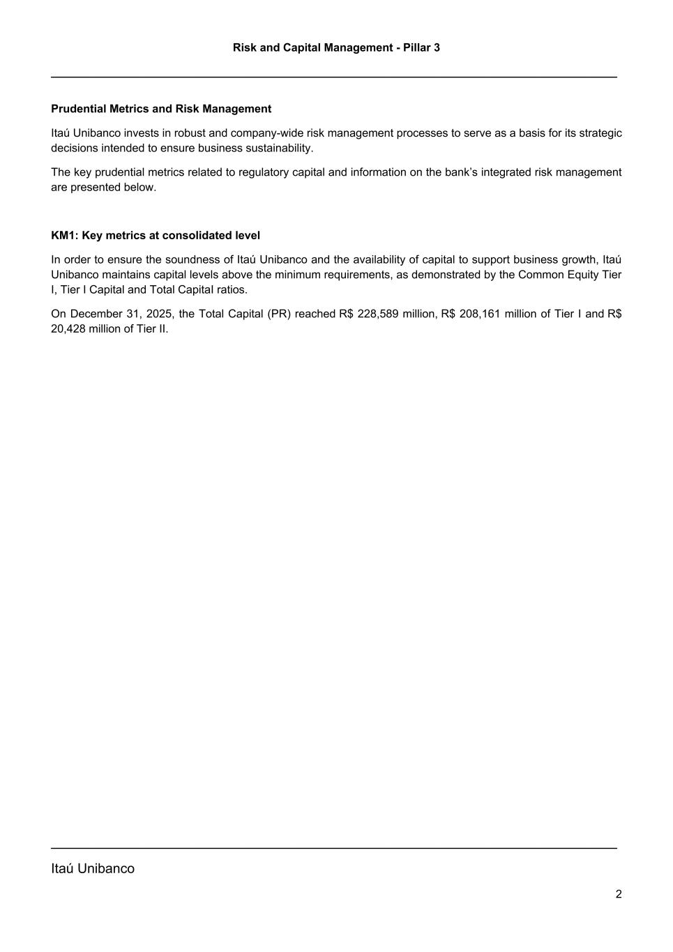Risk and Capital Management - Pillar 3 __________________________________________________________________________________________ __________________________________________________________________________________________ Itaú Unibanco 2 Prudential Metrics and Risk Management Itaú Unibanco invests in robust and company-wide risk management processes to serve as a basis for its strategic decisions intended to ensure business sustainability. The key prudential metrics related to regulatory capital and information on the bank’s integrated risk management are presented below. KM1: Key metrics at consolidated level In order to ensure the soundness of Itaú Unibanco and the availability of capital to support business growth, Itaú Unibanco maintains capital levels above the minimum requirements, as demonstrated by the Common Equity Tier I, Tier I Capital and Total CapitaI ratios. On December 31, 2025, the Total Capital (PR) reached R$ 228,589 million, R$ 208,161 million of Tier I and R$ 20,428 million of Tier II.