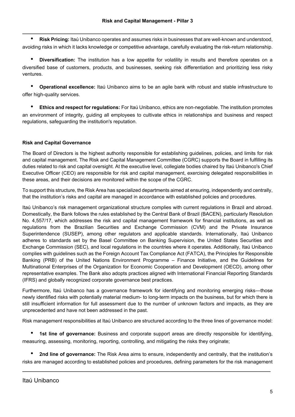 Risk and Capital Management - Pillar 3 __________________________________________________________________________________________ __________________________________________________________________________________________ Itaú Unibanco 5 • Risk Pricing: Itaú Unibanco operates and assumes risks in businesses that are well-known and understood, avoiding risks in which it lacks knowledge or competitive advantage, carefully evaluating the risk-return relationship. • Diversification: The institution has a low appetite for volatility in results and therefore operates on a diversified base of customers, products, and businesses, seeking risk differentiation and prioritizing less risky ventures. • Operational excellence: Itaú Unibanco aims to be an agile bank with robust and stable infrastructure to offer high-quality services. • Ethics and respect for regulations: For Itaú Unibanco, ethics are non-negotiable. The institution promotes an environment of integrity, guiding all employees to cultivate ethics in relationships and business and respect regulations, safeguarding the institution's reputation. Risk and Capital Governance The Board of Directors is the highest authority responsible for establishing guidelines, policies, and limits for risk and capital management. The Risk and Capital Management Committee (CGRC) supports the Board in fulfilling its duties related to risk and capital oversight. At the executive level, collegiate bodies chaired by Itaú Unibanco's Chief Executive Officer (CEO) are responsible for risk and capital management, exercising delegated responsibilities in these areas, and their decisions are monitored within the scope of the CGRC. To support this structure, the Risk Area has specialized departments aimed at ensuring, independently and centrally, that the institution’s risks and capital are managed in accordance with established policies and procedures. Itaú Unibanco’s risk management organizational structure complies with current regulations in Brazil and abroad. Domestically, the Bank follows the rules established by the Central Bank of Brazil (BACEN), particularly Resolution No. 4,557/17, which addresses the risk and capital management framework for financial institutions, as well as regulations from the Brazilian Securities and Exchange Commission (CVM) and the Private Insurance Superintendence (SUSEP), among other regulators and applicable standards. Internationally, Itaú Unibanco adheres to standards set by the Basel Committee on Banking Supervision, the United States Securities and Exchange Commission (SEC), and local regulations in the countries where it operates. Additionally, Itaú Unibanco complies with guidelines such as the Foreign Account Tax Compliance Act (FATCA), the Principles for Responsible Banking (PRB) of the United Nations Environment Programme – Finance Initiative, and the Guidelines for Multinational Enterprises of the Organization for Economic Cooperation and Development (OECD), among other representative examples. The Bank also adopts practices aligned with International Financial Reporting Standards (IFRS) and globally recognized corporate governance best practices. Furthermore, Itaú Unibanco has a governance framework for identifying and monitoring emerging risks—those newly identified risks with potentially material medium- to long-term impacts on the business, but for which there is still insufficient information for full assessment due to the number of unknown factors and impacts, as they are unprecedented and have not been addressed in the past. Risk management responsibilities at Itaú Unibanco are structured according to the three lines of governance model: • 1st line of governance: Business and corporate support areas are directly responsible for identifying, measuring, assessing, monitoring, reporting, controlling, and mitigating the risks they originate; • 2nd line of governance: The Risk Area aims to ensure, independently and centrally, that the institution’s risks are managed according to established policies and procedures, defining parameters for the risk management