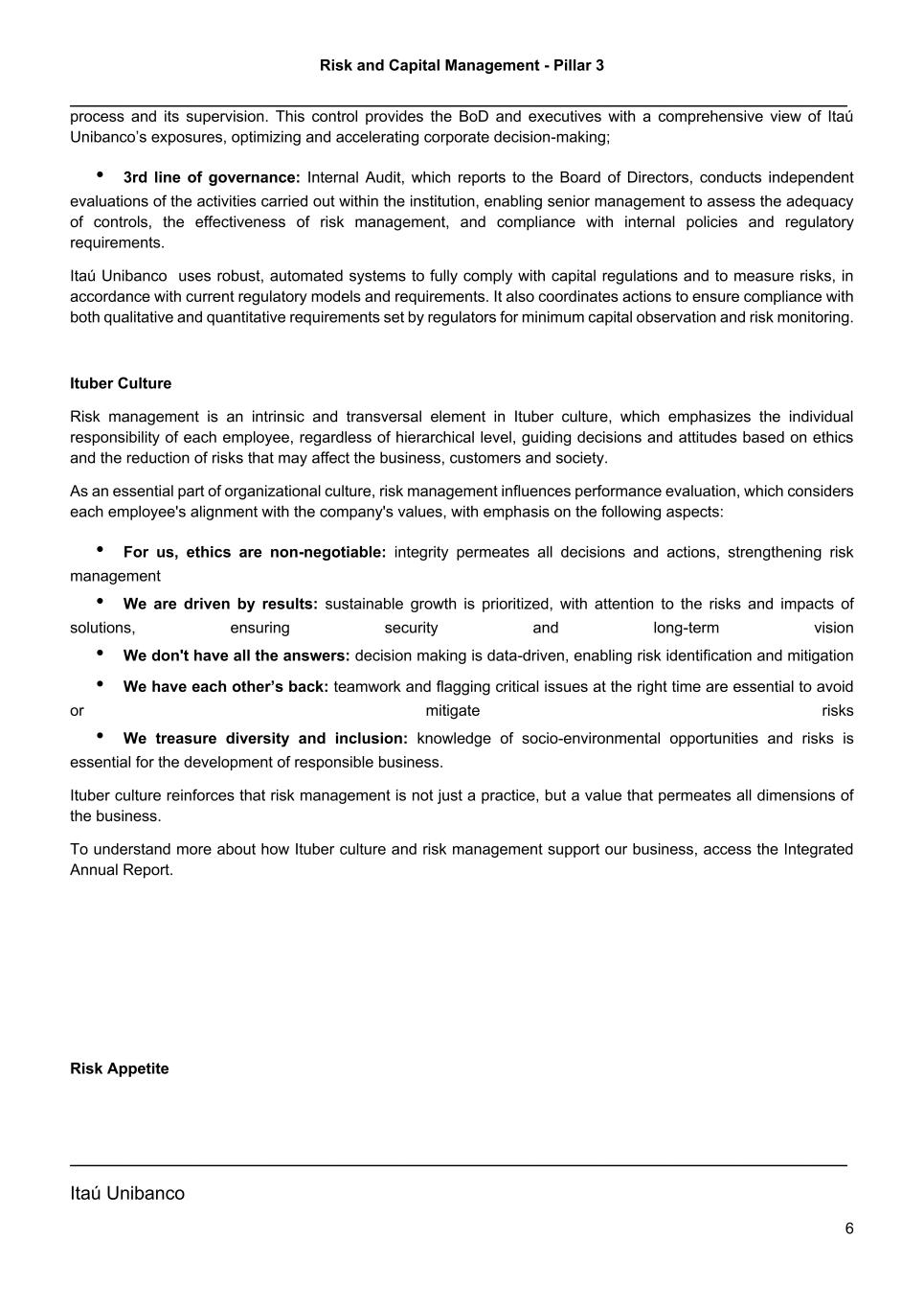 Risk and Capital Management - Pillar 3 __________________________________________________________________________________________ __________________________________________________________________________________________ Itaú Unibanco 6 process and its supervision. This control provides the BoD and executives with a comprehensive view of Itaú Unibanco’s exposures, optimizing and accelerating corporate decision-making; • 3rd line of governance: Internal Audit, which reports to the Board of Directors, conducts independent evaluations of the activities carried out within the institution, enabling senior management to assess the adequacy of controls, the effectiveness of risk management, and compliance with internal policies and regulatory requirements. Itaú Unibanco uses robust, automated systems to fully comply with capital regulations and to measure risks, in accordance with current regulatory models and requirements. It also coordinates actions to ensure compliance with both qualitative and quantitative requirements set by regulators for minimum capital observation and risk monitoring. Ituber Culture Risk management is an intrinsic and transversal element in Ituber culture, which emphasizes the individual responsibility of each employee, regardless of hierarchical level, guiding decisions and attitudes based on ethics and the reduction of risks that may affect the business, customers and society. As an essential part of organizational culture, risk management influences performance evaluation, which considers each employee's alignment with the company's values, with emphasis on the following aspects: • For us, ethics are non-negotiable: integrity permeates all decisions and actions, strengthening risk management • We are driven by results: sustainable growth is prioritized, with attention to the risks and impacts of solutions, ensuring security and long-term vision • We don't have all the answers: decision making is data-driven, enabling risk identification and mitigation • We have each other’s back: teamwork and flagging critical issues at the right time are essential to avoid or mitigate risks • We treasure diversity and inclusion: knowledge of socio-environmental opportunities and risks is essential for the development of responsible business. Ituber culture reinforces that risk management is not just a practice, but a value that permeates all dimensions of the business. To understand more about how Ituber culture and risk management support our business, access the Integrated Annual Report. Risk Appetite