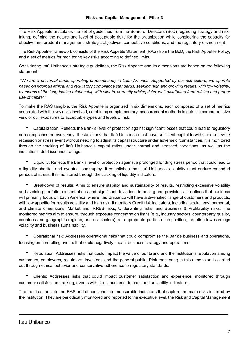 Risk and Capital Management - Pillar 3 __________________________________________________________________________________________ __________________________________________________________________________________________ Itaú Unibanco 7 The Risk Appetite articulates the set of guidelines from the Board of Directors (BoD) regarding strategy and risk- taking, defining the nature and level of acceptable risks for the organization while considering the capacity for effective and prudent management, strategic objectives, competitive conditions, and the regulatory environment. The Risk Appetite framework consists of the Risk Appetite Statement (RAS) from the BoD, the Risk Appetite Policy, and a set of metrics for monitoring key risks according to defined limits. Considering Itaú Unibanco’s strategic guidelines, the Risk Appetite and its dimensions are based on the following statement: “We are a universal bank, operating predominantly in Latin America. Supported by our risk culture, we operate based on rigorous ethical and regulatory compliance standards, seeking high and growing results, with low volatility, by means of the long-lasting relationship with clients, correctly pricing risks, well-distributed fund-raising and proper use of capital.” To make the RAS tangible, the Risk Appetite is organized in six dimensions, each composed of a set of metrics associated with the key risks involved, combining complementary measurement methods to obtain a comprehensive view of our exposures to acceptable types and levels of risk: • Capitalization: Reflects the Bank’s level of protection against significant losses that could lead to regulatory non-compliance or insolvency. It establishes that Itaú Unibanco must have sufficient capital to withstand a severe recession or stress event without needing to adjust its capital structure under adverse circumstances. It is monitored through the tracking of Itaú Unibanco’s capital ratios under normal and stressed conditions, as well as the institution’s debt issuance ratings. • Liquidity: Reflects the Bank’s level of protection against a prolonged funding stress period that could lead to a liquidity shortfall and eventual bankruptcy. It establishes that Itaú Unibanco’s liquidity must endure extended periods of stress. It is monitored through the tracking of liquidity indicators. • Breakdown of results: Aims to ensure stability and sustainability of results, restricting excessive volatility and avoiding portfolio concentrations and significant deviations in pricing and provisions. It defines that business will primarily focus on Latin America, where Itaú Unibanco will have a diversified range of customers and products, with low appetite for results volatility and high risk. It monitors Credit risk indicators, including social, environmental, and climate dimensions, Market and IRRBB risks, Underwriting risks, and Business & Profitability risks. The monitored metrics aim to ensure, through exposure concentration limits (e.g., industry sectors, counterparty quality, countries and geographic regions, and risk factors), an appropriate portfolio composition, targeting low earnings volatility and business sustainability. • Operational risk: Addresses operational risks that could compromise the Bank’s business and operations, focusing on controlling events that could negatively impact business strategy and operations. • Reputation: Addresses risks that could impact the value of our brand and the institution’s reputation among customers, employees, regulators, investors, and the general public. Risk monitoring in this dimension is carried out through ethical behavior and conservative adherence to regulatory standards. • Clients: Addresses risks that could impact customer satisfaction and experience, monitored through customer satisfaction tracking, events with direct customer impact, and suitability indicators. The metrics translate the RAS and dimensions into measurable indicators that capture the main risks incurred by the institution. They are periodically monitored and reported to the executive level, the Risk and Capital Management