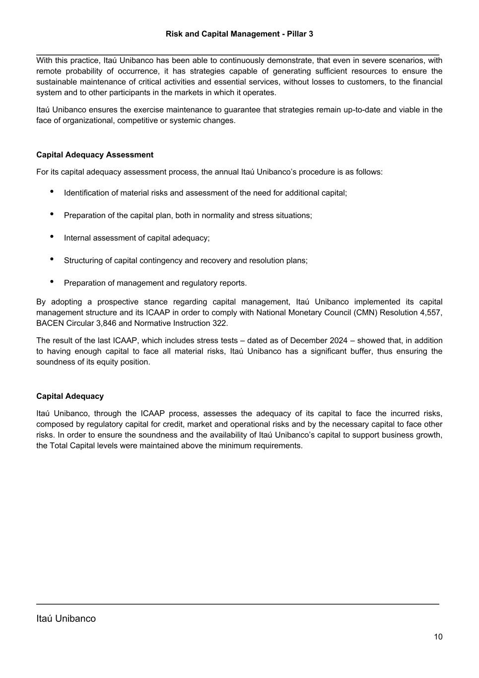 Risk and Capital Management - Pillar 3 __________________________________________________________________________________________ __________________________________________________________________________________________ Itaú Unibanco 10 With this practice, Itaú Unibanco has been able to continuously demonstrate, that even in severe scenarios, with remote probability of occurrence, it has strategies capable of generating sufficient resources to ensure the sustainable maintenance of critical activities and essential services, without losses to customers, to the financial system and to other participants in the markets in which it operates. Itaú Unibanco ensures the exercise maintenance to guarantee that strategies remain up-to-date and viable in the face of organizational, competitive or systemic changes. Capital Adequacy Assessment For its capital adequacy assessment process, the annual Itaú Unibanco’s procedure is as follows: • Identification of material risks and assessment of the need for additional capital; • Preparation of the capital plan, both in normality and stress situations; • Internal assessment of capital adequacy; • Structuring of capital contingency and recovery and resolution plans; • Preparation of management and regulatory reports. By adopting a prospective stance regarding capital management, Itaú Unibanco implemented its capital management structure and its ICAAP in order to comply with National Monetary Council (CMN) Resolution 4,557, BACEN Circular 3,846 and Normative Instruction 322. The result of the last ICAAP, which includes stress tests – dated as of December 2024 – showed that, in addition to having enough capital to face all material risks, Itaú Unibanco has a significant buffer, thus ensuring the soundness of its equity position. Capital Adequacy Itaú Unibanco, through the ICAAP process, assesses the adequacy of its capital to face the incurred risks, composed by regulatory capital for credit, market and operational risks and by the necessary capital to face other risks. In order to ensure the soundness and the availability of Itaú Unibanco’s capital to support business growth, the Total Capital levels were maintained above the minimum requirements.