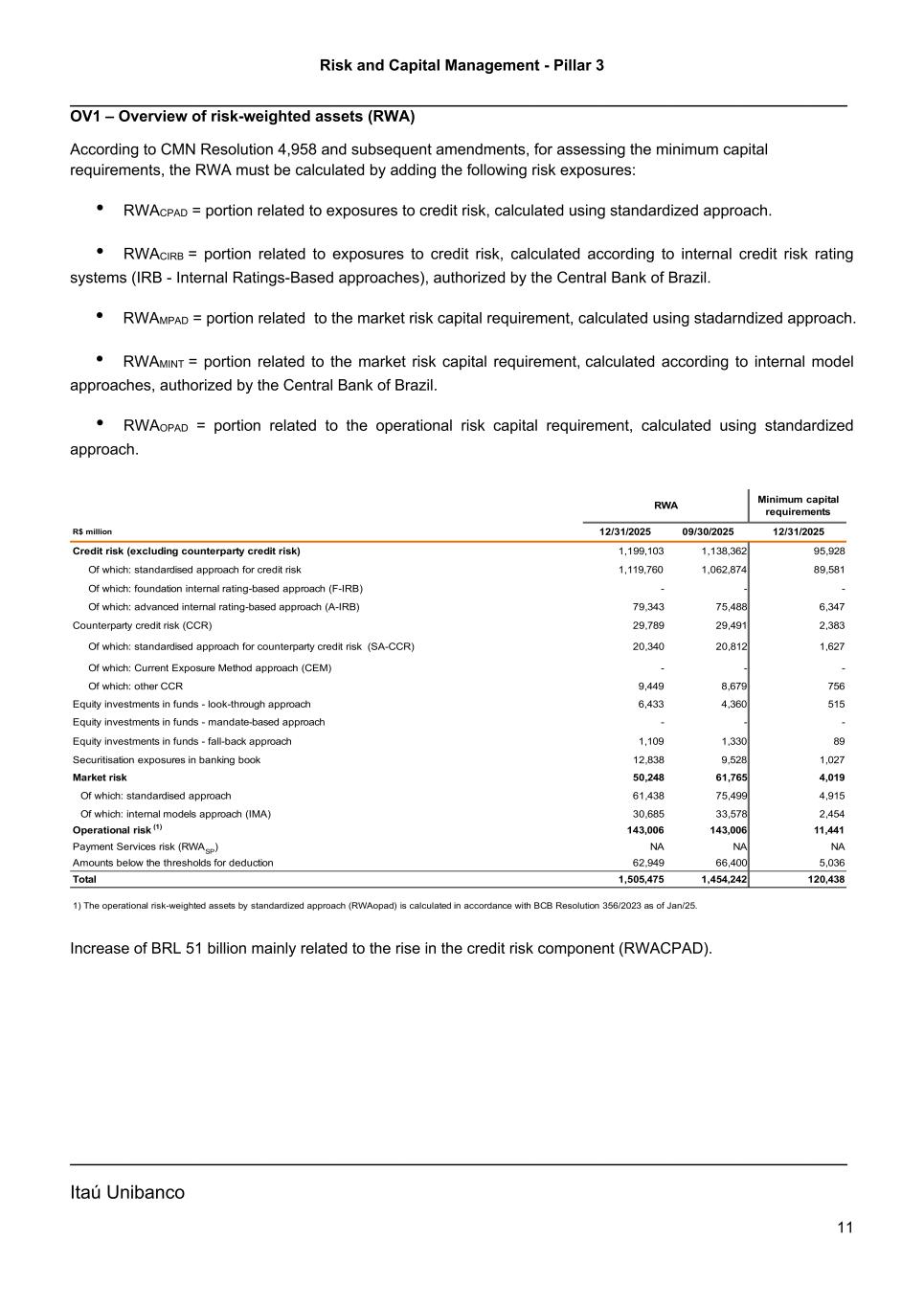 Risk and Capital Management - Pillar 3 __________________________________________________________________________________________ __________________________________________________________________________________________ Itaú Unibanco 11 OV1 – Overview of risk-weighted assets (RWA) According to CMN Resolution 4,958 and subsequent amendments, for assessing the minimum capital requirements, the RWA must be calculated by adding the following risk exposures: • RWACPAD = portion related to exposures to credit risk, calculated using standardized approach. • RWACIRB = portion related to exposures to credit risk, calculated according to internal credit risk rating systems (IRB - Internal Ratings-Based approaches), authorized by the Central Bank of Brazil. • RWAMPAD = portion related to the market risk capital requirement, calculated using stadarndized approach. • RWAMINT = portion related to the market risk capital requirement, calculated according to internal model approaches, authorized by the Central Bank of Brazil. • RWAOPAD = portion related to the operational risk capital requirement, calculated using standardized approach. a b c RWA Minimum capital requirements R$ million 12/31/2025 09/30/2025 12/31/2025 Credit risk (excluding counterparty credit risk) 1,199,103 1,138,362 95,928 Of which: standardised approach for credit risk 1,119,760 1,062,874 89,581 Of which: foundation internal rating-based approach (F-IRB) - - - Of which: advanced internal rating-based approach (A-IRB) 79,343 75,488 6,347 Counterparty credit risk (CCR) 29,789 29,491 2,383 Of which: standardised approach for counterparty credit risk (SA-CCR) 20,340 20,812 1,627 Of which: Current Exposure Method approach (CEM) - - - Of which: other CCR 9,449 8,679 756 Equity investments in funds - look-through approach 6,433 4,360 515 Equity investments in funds - mandate-based approach - - - Equity investments in funds - fall-back approach 1,109 1,330 89 Securitisation exposures in banking book 12,838 9,528 1,027 Market risk 50,248 61,765 4,019 Of which: standardised approach 61,438 75,499 4,915 Of which: internal models approach (IMA) 30,685 33,578 2,454 Operational risk (1) 143,006 143,006 11,441 Payment Services risk (RWA SP ) NA NA NA Amounts below the thresholds for deduction 62,949 66,400 5,036 Total 1,505,475 1,454,242 120,438 1) The operational risk-weighted assets by standardized approach (RWAopad) is calculated in accordance with BCB Resolution 356/2023 as of Jan/25. Increase of BRL 51 billion mainly related to the rise in the credit risk component (RWACPAD).