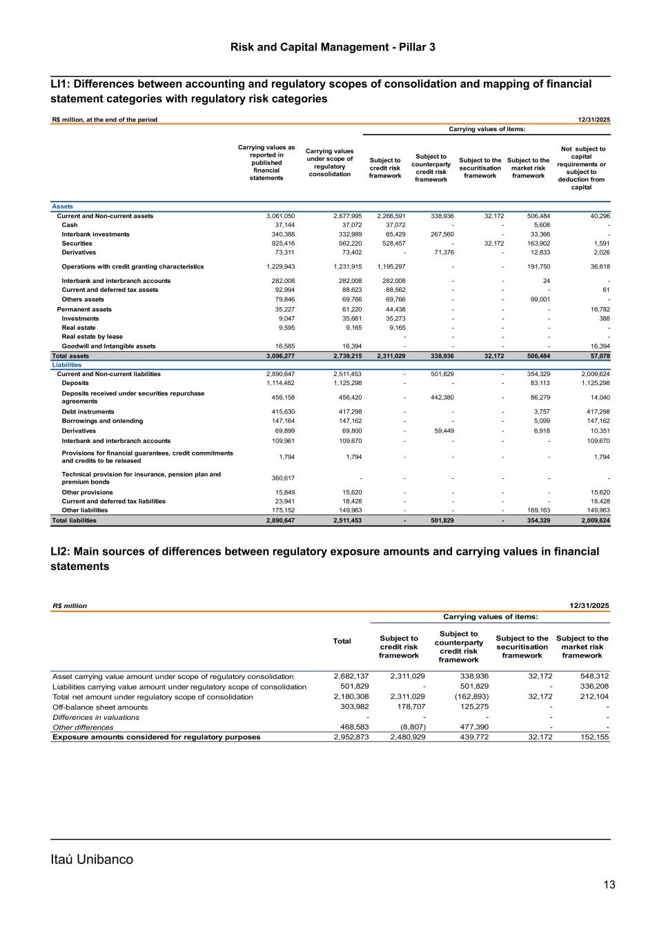 Risk and Capital Management - Pillar 3 __________________________________________________________________________________________ __________________________________________________________________________________________ Itaú Unibanco 13 LI1: Differences between accounting and regulatory scopes of consolidation and mapping of financial statement categories with regulatory risk categories R$ million, at the end of the period 12/31/2025 Carrying values as reported in published financial statements Carrying values under scope of regulatory consolidation Carrying values of items: Subject to credit risk framework Subject to counterparty credit risk framework Subject to the securitisation framework Subject to the market risk framework Not subject to capital requirements or subject to deduction from capital Assets Current and Non-current assets 3,061,050 2,677,995 2,266,591 338,936 32,172 506,484 40,296 Cash 37,144 37,072 37,072 - - 5,608 - Interbank investments 340,388 332,989 65,429 267,560 - 33,366 - Securities 925,416 562,220 528,457 - 32,172 163,902 1,591 Derivatives 73,311 73,402 - 71,376 - 12,833 2,026 Operations with credit granting characteristics 1,229,943 1,231,915 1,195,297 - - 191,750 36,618 Interbank and interbranch accounts 282,008 282,008 282,008 - - 24 - Current and deferred tax assets 92,994 88,623 88,562 - - - 61 Others assets 79,846 69,766 69,766 - - 99,001 - Permanent assets 35,227 61,220 44,438 - - - 16,782 Investments 9,047 35,661 35,273 - - - 388 Real estate 9,595 9,165 9,165 - - - - Real estate by lease - - - - - Goodwill and Intangible assets 16,585 16,394 - - - - 16,394 Total assets 3,096,277 2,739,215 2,311,029 338,936 32,172 506,484 57,078 Liabilities Current and Non-current liabilities 2,890,647 2,511,453 - 501,829 - 354,329 2,009,624 Deposits 1,114,482 1,125,298 - - - 83,113 1,125,298 Deposits received under securities repurchase agreements 456,158 456,420 - 442,380 - 86,279 14,040 Debt instruments 415,630 417,298 - - - 3,757 417,298 Borrowings and onlending 147,164 147,162 - - - 5,099 147,162 Derivatives 69,899 69,800 - 59,449 - 6,918 10,351 Interbank and interbranch accounts 109,961 109,670 - - - - 109,670 Provisions for financial guarantees, credit commitments and credits to be released 1,794 1,794 - - - - 1,794 Technical provision for insurance, pension plan and premium bonds 360,617 - - - - - - Other provisions 15,849 15,620 - - - - 15,620 Current and deferred tax liabilities 23,941 18,428 - - - - 18,428 Other liabilities 175,152 149,963 - - - 169,163 149,963 Total liabilities 2,890,647 2,511,453 - 501,829 - 354,329 2,009,624 LI2: Main sources of differences between regulatory exposure amounts and carrying values in financial statements R$ million 12/31/2025 Total Carrying values of items: Subject to credit risk framework Subject to counterparty credit risk framework Subject to the securitisation framework Subject to the market risk framework Asset carrying value amount under scope of regulatory consolidation 2,682,137 2,311,029 338,936 32,172 548,312 Liabilities carrying value amount under regulatory scope of consolidation 501,829 - 501,829 - 336,208 Total net amount under regulatory scope of consolidation 2,180,308 2,311,029 (162,893) 32,172 212,104 Off-balance sheet amounts 303,982 178,707 125,275 - - Differences in valuations - - - - - Other differences 468,583 (8,807) 477,390 - - Exposure amounts considered for regulatory purposes 2,952,873 2,480,929 439,772 32,172 152,155