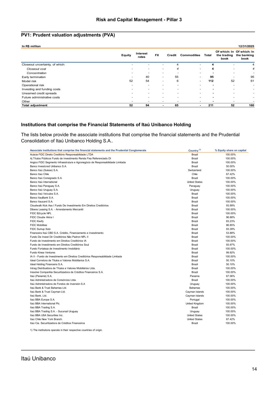 Risk and Capital Management - Pillar 3 __________________________________________________________________________________________ __________________________________________________________________________________________ Itaú Unibanco 14 PV1: Prudent valuation adjustments (PVA) In R$ million 12/31/2025 Equity Interest rates FX Credit Commodities Total Of which: In the trading book Of which: In the banking book Closeout uncertainty, of which: - - - 4 - 4 - 4 Closeout cost - - - 4 - 4 - 4 Concentration - - - - - - - - Early termination - 40 - 55 - 95 - 95 Model risk 52 54 - 6 - 112 52 61 Operational risk - - - - - - - - Investing and funding costs - - - - - - - - Unearned credit spreads - - - - - - - - Future administrative costs - - - - - - - - Other - - - - - - - - Total adjustment 52 94 - 65 - 211 52 160 Institutions that comprise the Financial Statements of Itaú Unibanco Holding The lists below provide the associate institutions that comprise the financial statements and the Prudential Consolidation of Itaú Unibanco Holding S.A.. Associate institutions that comprise the financial statements and the Prudential Conglomerate Country (1) % Equity share on capital Acácia FIDC Direito Creditório Responsabilidade LTDA Brazil 100.00% Aj Títulos Públicos Fundo de Investimento Renda Fixa Referenciado DI Brazil 100.00% Angico FIDC Segmento Infraestrutura e Agronegócio de Responsabilidade Limitada Brazil 100.00% Banco Investcred Unibanco S.A. Brazil 50.00% Banco Itaú (Suisse) S.A. Switzerland 100.00% Banco Itaú Chile Chile 67.42% Banco Itaú Consignado S.A. Brazil 100.00% Banco Itaú International United States 100.00% Banco Itaú Paraguay S.A. Paraguay 100.00% Banco Itaú Uruguay S.A. Uruguay 100.00% Banco Itaú Veículos S.A. Brazil 100.00% Banco ItauBank S.A. Brazil 100.00% Banco Itaucard S.A. Brazil 100.00% Cloudwalk Kick Ass I Fundo De Investimento Em Direitos Creditórios Brazil 93.99% Dibens Leasing S.A. - Arrendamento Mercantil Brazil 100.00% FIDC B2cycle NPL Brazil 100.00% FIDC Cloudw Akira I Brazil 96.88% FIDC Kiwify Brazil 83.23% FIDC Mobilitas Brazil 86.85% FIDC Sumup Solo Brazil 93.39% Financeira Itaú CBD S.A. Crédito, Financiamento e Investimento Brazil 53.88% Fundo De Invest Dir Creditórios Não Padron NPL II Brazil 100.00% Fundo de Investimento em Direitos Creditórios IA Brazil 100.00% Fundo de Investimento em Direitos Creditórios Soul Brazil 93.97% Fundo Fortaleza de Investimento Imobiliário Brazil 100.00% Fundo Kinea Ventures Brazil 99.92% IA II - Fundo de Investimento em Direitos Creditórios Responsabilidade Limitada Brazil 100.00% Ideal Corretora de Titulos e Valores Mobiliarios S.A. Brazil 50.10% Ideal Holding Financeira S.A. Brazil 50.10% Intrag Distribuidora de Títulos e Valores Mobiliários Ltda. Brazil 100.00% Iresolve Companhia Securitizadora de Créditos Financeiros S.A. Brazil 100.00% Itaú (Panamá) S.A. Panama 67.06% Itaú Administradora de Consórcios Ltda. Brazil 100.00% Itaú Administradora de Fondos de Inversión S.A Uruguay 100.00% Itaú Bank & Trust Bahamas Ltd. Bahamas 100.00% Itaú Bank & Trust Cayman Ltd. Cayman Islands 100.00% Itaú Bank, Ltd. Cayman Islands 100.00% Itaú BBA Europe S.A. Portugal 100.00% Itaú BBA International Plc. United Kingdom 100.00% Itaú BBA Trading S.A. Brazil 100.00% Itaú BBA Trading S.A. - Sucursal Uruguay Uruguay 100.00% Itaú BBA USA Securities Inc. United States 100.00% Itaú Chile New York Branch. United States 67.42% Itaú Cia. Securitizadora de Créditos Financeiros Brazil 100.00% 1) The institutions operate in their respective countries of origin.