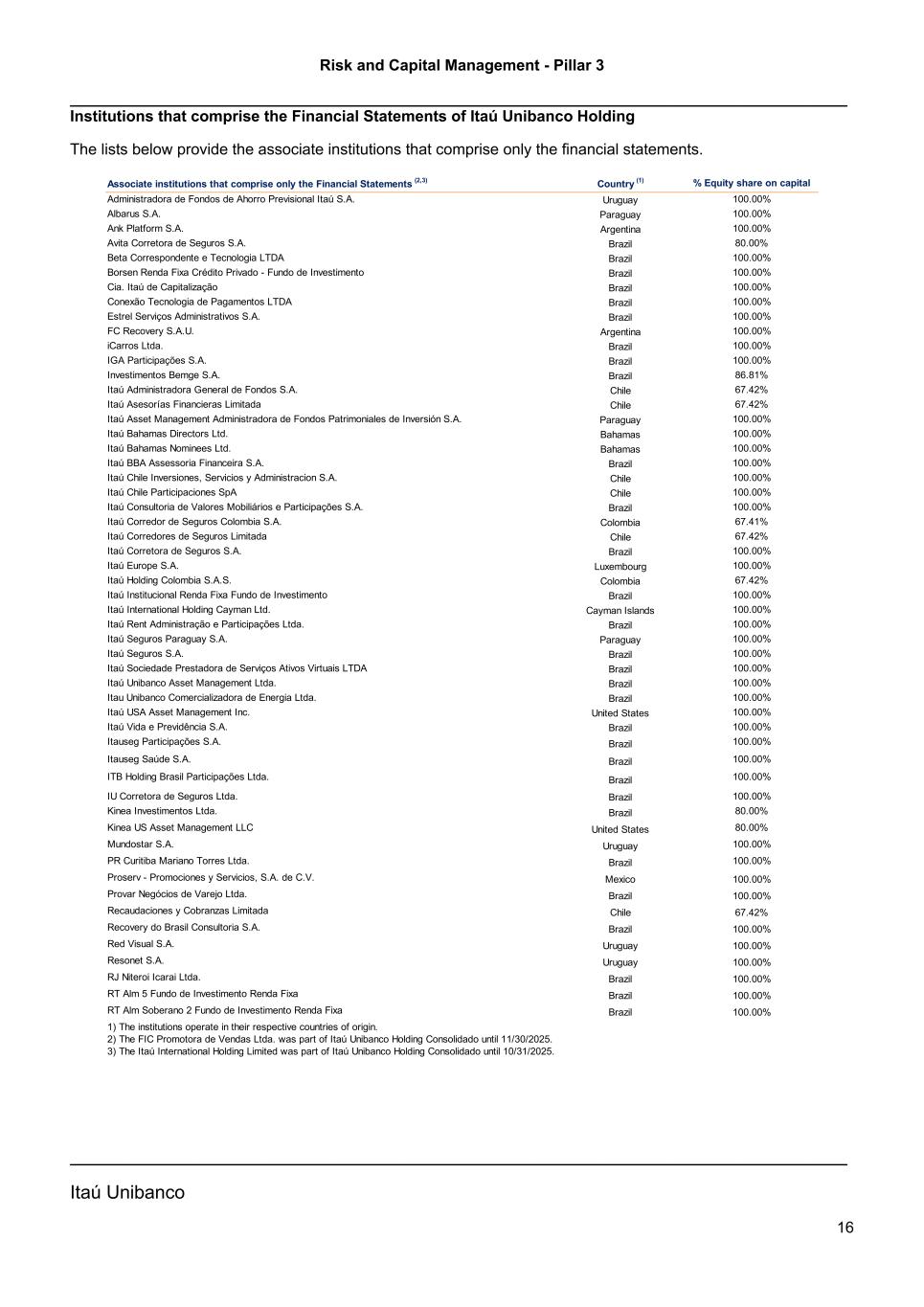 Risk and Capital Management - Pillar 3 __________________________________________________________________________________________ __________________________________________________________________________________________ Itaú Unibanco 15 Associate institutions that comprise the financial statements and the Prudential Conglomerate (2) Country (1) % Equity share on capital Itaú Colombia S.A Colombia 67.06% Itaú Comisionista de Bolsa Colombia S.A. Colombia 67.06% Itaú Corredores de Bolsa Limitada Chile 67.42% Itaú Corretora de Valores S.A. Brazil 100.00% Itaú Fiduciaria Colombia S.A. Sociedad Fiduciaria Colombia 67.04% Itaú International Securities Inc. United States 100.00% Itaú Invest Casa de Bolsa S.A. Paraguay 100.00% Itau Isento Julho 28 FIC de Fundos Infra RF Incentivo Resp Limitada (3) Brazil - Itau Isento Marco 28 Fundo de Investimento em Cotas de FIIF em Infra RF - Resp Limitada Brazil 6.76% Itau Isento Marco 29 Fundo de Investimento em Cotas de FIIF em Infra RF - Resp Limitada Brazil 1.00% Itau Isento Setembro 28 Fundo de Investimento em Cotas de FIIF em Infra RF Resp Limitada Brazil 8.43% Itau Isento Setembro 29 FIC de Fundos Incentivados Brazil 0.38% Itaú Kinea Private Equity Multimercado Fundo de Investimento em Cotas de Fundos de Investimento Crédito Privado Brazil 100.00% Itaú Unibanco Holding S.A. Brazil 100.00% Itaú Unibanco Holding S.A., Grand Cayman Branch Cayman Islands 100.00% Itaú Unibanco S.A. Brazil 100.00% Itaú Unibanco S.A., Miami Branch United States 100.00% Itaú Unibanco S.A., Nassau Branch Bahamas 100.00% Itaú Unibanco Veículos Administradora de Consórcios Ltda. Brazil 100.00% ITB Holding Ltd. Cayman Islands 100.00% Kinea CO-investimento Fundo de Investimento Imobiliario Brazil 99.98% Kinea Equity Infra I Warehouse Feeder MM Ficfi CP Brazil 100.00% Kinea FOF Imobiliário FIF Multimercado - Responsabilidade Limitada Brazil 75.49% Kinea I Private Equity FIP Multiestrategia Brazil 99.68% Kinea KP Fundo de Investimento Multimercado Crédito Privado Brazil 100.00% Licania Fund Limited Cayman Islands 100.00% Luizacred S.A. Sociedade de Crédito, Financiamento e Investimento Brazil 50.00% Microinvest S.A. Soc. de Crédito a Microempreendedor Brazil 100.00% NC 2025 Fundo de Investimento em Direitos Creditórios Brazil 100.00% NC 2025 I Fundo de Investimento em Direitos Creditórios Brazil 100.00% OCA Dinero Electrónico S.A. Uruguay 100.00% OCA S.A. Uruguay 100.00% Oiti Fundo de Investimento Multimercado Crédito Privado Investimento no Exterior Brazil 100.00% Pont Sociedad Anónima Paraguay 100.00% Redecard Instituição de Pagamento S.A. Brazil 100.00% Redecard Sociedade de Crédito Direto S.A Brazil 100.00% RT Itaú DJ Títulos Públicos Fundo de Investimento Renda Fixa Referenciado DI Brazil 100.00% RT Scala Renda Fixa - Fundo de Investimento em Cotas de Fundos de Investimento Brazil 100.00% Tangerina Fundo de Investimento em Direitos Creditórios - Responsabilidade Limitada Brazil 100.00% Tarumã 2 FIF Fundo Incentivado em Investimento em Deb de Infra RF Cred Priv Resp Limitada Brazil 100.00% Tarumã Fundo Incentivado de Investimento em Debêntures de Infraestrutura Renda Fixa Crédito Privado Brazil 100.00% Théros Fundo de Investimento nas Cadeias Produtivas Brazil 100.00% TOP 2025 I Fundo de Investimento em Direitos Creditórios Responsabilidade Limitada Brazil 100.00% Vitex FIF Fundo Incentivado em Investimento em Debêntures de Infra RF Cred Priv Resp Limitada Brazil 100.00% 1) The institutions operate in their respective countries of origin. 2) The TOP 2025 Fundo de Investimento em Direitos Creditórios o Itaú Unibanco Holding Consolidated until September 30, 2025. 3) New corporate name of social da Itau Isento Marco 30 FIC de Fundos Incentivados de Inv Financeiro em Infra RF Resp Limitada