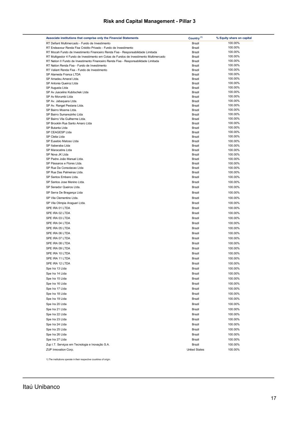 Risk and Capital Management - Pillar 3 __________________________________________________________________________________________ __________________________________________________________________________________________ Itaú Unibanco 17 Associate institutions that comprise only the Financial Statements Country (1) % Equity share on capital RT Defiant Multimercado - Fundo de Investimento Brazil 100.00% RT Endeavour Renda Fixa Crédito Privado - Fundo de Investimento Brazil 100.00% RT Mocah Fundo de Investimento Financeiro Renda Fixa - Responsabilidade Limitada Brazil 100.00% RT Multigestor 4 Fundo de Investimento em Cotas de Fundos de Investimento Multimercado Brazil 100.00% RT Nation II Fundo de Investimento Financeiro Renda Fixa - Responsabilidade Limitada Brazil 100.00% RT Nation Renda Fixa - Fundo de Investimento Brazil 100.00% RT Valiant Renda Fixa - Fundo de Investimento Brazil 100.00% SP Alameda Franca LTDA Brazil 100.00% SP Amadeu Amaral Ltda. Brazil 100.00% SP Antonia Queiroz Ltda Brazil 100.00% SP Augusta Ltda Brazil 100.00% SP Av Juscelino Kubitschek Ltda Brazil 100.00% SP Av Morumbi Ltda Brazil 100.00% SP Av. Jabaquara Ltda. Brazil 100.00% SP Av. Rangel Pestana Ltda. Brazil 100.00% SP Bairro Moema Ltda. Brazil 100.00% SP Bairro Sumarezinho Ltda Brazil 100.00% SP Bairro Vila Guilherme Ltda. Brazil 100.00% SP Brooklin Rua Santo Amaro Ltda Brazil 100.00% SP Butanta Ltda Brazil 100.00% SP CEAGESP Ltda Brazil 100.00% SP Clelia Ltda Brazil 100.00% SP Eusebio Matoso Ltda Brazil 100.00% SP Itaberaba Ltda Brazil 100.00% SP Maracatins Ltda Brazil 100.00% SP Nova JK Ltda Brazil 100.00% SP Padre João Manuel Ltda. Brazil 100.00% SP Pássaros e Flores Ltda. Brazil 100.00% SP Rua Da Consolacao Ltda Brazil 100.00% SP Rua Das Palmeiras Ltda. Brazil 100.00% SP Santos Embare Ltda. Brazil 100.00% SP Santos Jose Menino Ltda. Brazil 100.00% SP Senador Queiros Ltda. Brazil 100.00% SP Serra De Bragança Ltda Brazil 100.00% SP Vila Clementino Ltda. Brazil 100.00% SP Vila Olimpia Araguari Ltda. Brazil 100.00% SPE IRA 01 LTDA Brazil 100.00% SPE IRA 02 LTDA Brazil 100.00% SPE IRA 03 LTDA Brazil 100.00% SPE IRA 04 LTDA Brazil 100.00% SPE IRA 05 LTDA Brazil 100.00% SPE IRA 06 LTDA Brazil 100.00% SPE IRA 07 LTDA Brazil 100.00% SPE IRA 08 LTDA Brazil 100.00% SPE IRA 09 LTDA Brazil 100.00% SPE IRA 10 LTDA Brazil 100.00% SPE IRA 11 LTDA Brazil 100.00% SPE IRA 12 LTDA Brazil 100.00% Spe Ira 13 Ltda Brazil 100.00% Spe Ira 14 Ltda Brazil 100.00% Spe Ira 15 Ltda Brazil 100.00% Spe Ira 16 Ltda Brazil 100.00% Spe Ira 17 Ltda Brazil 100.00% Spe Ira 18 Ltda Brazil 100.00% Spe Ira 19 Ltda Brazil 100.00% Spe Ira 20 Ltda Brazil 100.00% Spe Ira 21 Ltda Brazil 100.00% Spe Ira 22 Ltda Brazil 100.00% Spe Ira 23 Ltda Brazil 100.00% Spe Ira 24 Ltda Brazil 100.00% Spe Ira 25 Ltda Brazil 100.00% Spe Ira 26 Ltda Brazil 100.00% Spe Ira 27 Ltda Brazil 100.00% Zup I.T. Serviços em Tecnologia e Inovação S.A. Brazil 100.00% ZUP Innovation Corp. United States 100.00% 1) The institutions operate in their respective countries of origin.