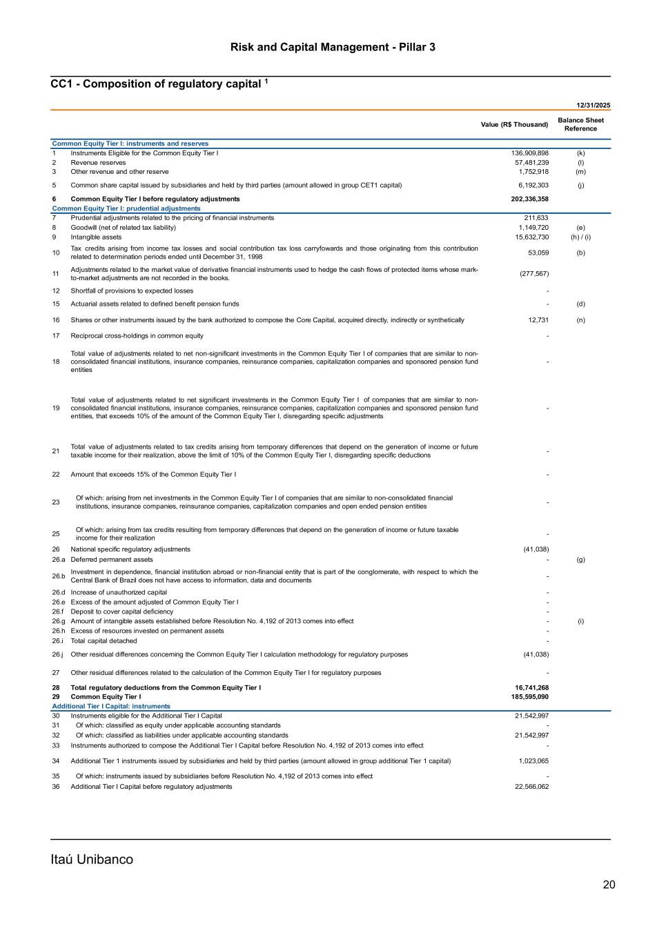 Risk and Capital Management - Pillar 3 __________________________________________________________________________________________ __________________________________________________________________________________________ Itaú Unibanco 20 CC1 - Composition of regulatory capital 1 12/31/2025 Value (R$ Thousand) Balance Sheet Reference Common Equity Tier I: instruments and reserves 1 Instruments Eligible for the Common Equity Tier I 136,909,898 (k) 2 Revenue reserves 57,481,239 (l) 3 Other revenue and other reserve 1,752,918 (m) 5 Common share capital issued by subsidiaries and held by third parties (amount allowed in group CET1 capital) 6,192,303 (j) 6 Common Equity Tier I before regulatory adjustments 202,336,358 Common Equity Tier I: prudential adjustments 7 Prudential adjustments related to the pricing of financial instruments 211,633 8 Goodwill (net of related tax liability) 1,149,720 (e) 9 Intangible assets 15,632,730 (h) / (i) 10 Tax credits arising from income tax losses and social contribution tax loss carryfowards and those originating from this contribution related to determination periods ended until December 31, 1998 53,059 (b) 11 Adjustments related to the market value of derivative financial instruments used to hedge the cash flows of protected items whose mark- to-market adjustments are not recorded in the books. (277,567) 12 Shortfall of provisions to expected losses - 15 Actuarial assets related to defined benefit pension funds - (d) 16 Shares or other instruments issued by the bank authorized to compose the Core Capital, acquired directly, indirectly or synthetically 12,731 (n) 17 Reciprocal cross-holdings in common equity - 18 Total value of adjustments related to net non-significant investments in the Common Equity Tier I of companies that are similar to non- consolidated financial institutions, insurance companies, reinsurance companies, capitalization companies and sponsored pension fund entities - 19 Total value of adjustments related to net significant investments in the Common Equity Tier I of companies that are similar to non- consolidated financial institutions, insurance companies, reinsurance companies, capitalization companies and sponsored pension fund entities, that exceeds 10% of the amount of the Common Equity Tier I, disregarding specific adjustments - 21 Total value of adjustments related to tax credits arising from temporary differences that depend on the generation of income or future taxable income for their realization, above the limit of 10% of the Common Equity Tier I, disregarding specific deductions - 22 Amount that exceeds 15% of the Common Equity Tier I - 23 Of which: arising from net investments in the Common Equity Tier I of companies that are similar to non-consolidated financial institutions, insurance companies, reinsurance companies, capitalization companies and open ended pension entities - 25 Of which: arising from tax credits resulting from temporary differences that depend on the generation of income or future taxable income for their realization - 26 National specific regulatory adjustments (41,038) 26.a Deferred permanent assets - (g) 26.b Investment in dependence, financial institution abroad or non-financial entity that is part of the conglomerate, with respect to which the Central Bank of Brazil does not have access to information, data and documents - 26.d Increase of unauthorized capital - 26.e Excess of the amount adjusted of Common Equity Tier I - 26.f Deposit to cover capital deficiency - 26.g Amount of intangible assets established before Resolution No. 4,192 of 2013 comes into effect - (i) 26.h Excess of resources invested on permanent assets - 26.i Total capital detached - 26.j Other residual differences concerning the Common Equity Tier I calculation methodology for regulatory purposes (41,038) 27 Other residual differences related to the calculation of the Common Equity Tier I for regulatory purposes - 28 Total regulatory deductions from the Common Equity Tier I 16,741,268 29 Common Equity Tier I 185,595,090 Additional Tier I Capital: instruments 30 Instruments eligible for the Additional Tier I Capital 21,542,997 31 Of which: classified as equity under applicable accounting standards - 32 Of which: classified as liabilities under applicable accounting standards 21,542,997 33 Instruments authorized to compose the Additional Tier I Capital before Resolution No. 4,192 of 2013 comes into effect - 34 Additional Tier 1 instruments issued by subsidiaries and held by third parties (amount allowed in group additional Tier 1 capital) 1,023,065 35 Of which: instruments issued by subsidiaries before Resolution No. 4,192 of 2013 comes into effect - 36 Additional Tier I Capital before regulatory adjustments 22,566,062