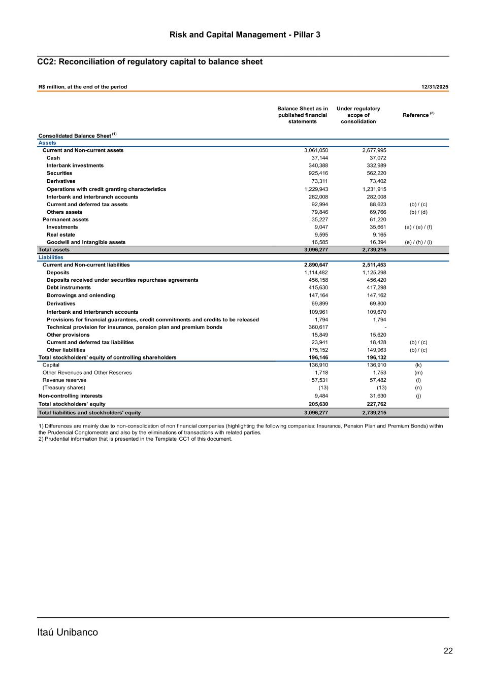 Risk and Capital Management - Pillar 3 __________________________________________________________________________________________ __________________________________________________________________________________________ Itaú Unibanco 22 CC2: Reconciliation of regulatory capital to balance sheet R$ million, at the end of the period 12/31/2025 Consolidated Balance Sheet (1) Balance Sheet as in published financial statements Under regulatory scope of consolidation Reference (2) Assets Current and Non-current assets 3,061,050 2,677,995 Cash 37,144 37,072 Interbank investments 340,388 332,989 Securities 925,416 562,220 Derivatives 73,311 73,402 Operations with credit granting characteristics 1,229,943 1,231,915 Interbank and interbranch accounts 282,008 282,008 Current and deferred tax assets 92,994 88,623 (b) / (c) Others assets 79,846 69,766 (b) / (d) Permanent assets 35,227 61,220 Investments 9,047 35,661 (a) / (e) / (f) Real estate 9,595 9,165 Goodwill and Intangible assets 16,585 16,394 (e) / (h) / (i) Total assets 3,096,277 2,739,215 Liabilities Current and Non-current liabilities 2,890,647 2,511,453 Deposits 1,114,482 1,125,298 Deposits received under securities repurchase agreements 456,158 456,420 Debt instruments 415,630 417,298 Borrowings and onlending 147,164 147,162 Derivatives 69,899 69,800 Interbank and interbranch accounts 109,961 109,670 Provisions for financial guarantees, credit commitments and credits to be released 1,794 1,794 Technical provision for insurance, pension plan and premium bonds 360,617 - Other provisions 15,849 15,620 Current and deferred tax liabilities 23,941 18,428 (b) / (c) Other liabilities 175,152 149,963 (b) / (c) Total stockholders' equity of controlling shareholders 196,146 196,132 Capital 136,910 136,910 (k) Other Revenues and Other Reserves 1,718 1,753 (m) Revenue reserves 57,531 57,482 (l) (Treasury shares) (13) (13) (n) Non-controlling interests 9,484 31,630 (j) Total stockholders’ equity 205,630 227,762 Total liabilities and stockholders' equity 3,096,277 2,739,215 1) Differences are mainly due to non-consolidation of non financial companies (highlighting the following companies: Insurance, Pension Plan and Premium Bonds) within the Prudencial Conglomerate and also by the eliminations of transactions with related parties. 2) Prudential information that is presented in the Template CC1 of this document.