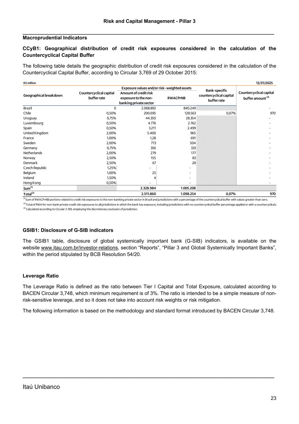 Risk and Capital Management - Pillar 3 __________________________________________________________________________________________ __________________________________________________________________________________________ Itaú Unibanco 23 Macroprudential Indicators CCyB1: Geographical distribution of credit risk exposures considered in the calculation of the Countercyclical Capital Buffer The following table details the geographic distribution of credit risk exposures considered in the calculation of the Countercyclical Capital Buffer, according to Circular 3,769 of 29 October 2015: GSIB1: Disclosure of G-SIB indicators The GSIB1 table, disclosure of global systemically important bank (G-SIB) indicators, is available on the website www.itau.com.br/investor-relations, section “Reports”, “Pillar 3 and Global Systemically Important Banks”, within the period stipulated by BCB Resolution 54/20. Leverage Ratio The Leverage Ratio is defined as the ratio between Tier I Capital and Total Exposure, calculated according to BACEN Circular 3,748, which minimum requirement is of 3%. The ratio is intended to be a simple measure of non- risk-sensitive leverage, and so it does not take into account risk weights or risk mitigation. The following information is based on the methodology and standard format introduced by BACEN Circular 3,748. R$ million 12/31/2025 Amount of credit risk exposure to the non- banking private sector RWACPrNB Brazil 0 2.068.892 840.249 - Chile 0,50% 200.695 128.563 0,07% 970 Uruguay 0,75% 44.350 28.354 - Luxembourg 0,50% 4.776 2.762 - Spain 0,50% 3.211 2.499 - United Kingdom 2,00% 5.400 965 - France 1,00% 1,28 691 - Sweden 2,00% 773 504 - Germany 0,75% 356 333 - Netherlands 2,00% 279 177 - Norway 2,50% 155 83 - Denmark 2,50% 67 28 - Czech Republic 1,25% - - - Belgium 1,00% 25 - - Ireland 1,50% 4 - - Hong Kong 0,50% - - - Sum(1) 2.328.984 1.005.208 Total(2) 2.511.860 1.098.254 0,07% 970 (1) Sum of RWACPrNBi portions related to credit risk exposures to the non-banking private sector in Brazil and jurisdictions with a percentage of the countercyclical buffer with values greater than zero. (2) Total of RWA for non-bank private credit risk exposures to all jurisdictions in which the bank has exposure, including jurisdictions with no countercyclical buffer percentage applied or with a countercyclical percentage equal to zero. (3) Calculated according to Circular 3.769, employing the discretionary exclusion of jurisdiction. Geographical breakdown Countercyclical capital buffer rate Exposure values and/or risk- weighted assets Bank-specific countercyclical capital buffer rate Countercyclical capital buffer amount (3)