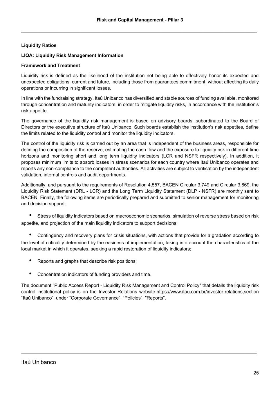 Risk and Capital Management - Pillar 3 __________________________________________________________________________________________ __________________________________________________________________________________________ Itaú Unibanco 25 Liquidity Ratios LIQA: Liquidity Risk Management Information Framework and Treatment Liquidity risk is defined as the likelihood of the institution not being able to effectively honor its expected and unexpected obligations, current and future, including those from guarantees commitment, without affecting its daily operations or incurring in significant losses. In line with the fundraising strategy, Itaú Unibanco has diversified and stable sources of funding available, monitored through concentration and maturity indicators, in order to mitigate liquidity risks, in accordance with the institution's risk appetite. The governance of the liquidity risk management is based on advisory boards, subordinated to the Board of Directors or the executive structure of Itaú Unibanco. Such boards establish the institution's risk appetites, define the limits related to the liquidity control and monitor the liquidity indicators. The control of the liquidity risk is carried out by an area that is independent of the business areas, responsible for defining the composition of the reserve, estimating the cash flow and the exposure to liquidity risk in different time horizons and monitoring short and long term liquidity indicators (LCR and NSFR respectively). In addition, it proposes minimum limits to absorb losses in stress scenarios for each country where Itaú Unibanco operates and reports any non-compliance to the competent authorities. All activities are subject to verification by the independent validation, internal controls and audit departments. Additionally, and pursuant to the requirements of Resolution 4,557, BACEN Circular 3,749 and Circular 3,869, the Liquidity Risk Statement (DRL - LCR) and the Long Term Liquidity Statement (DLP - NSFR) are monthly sent to BACEN. Finally, the following items are periodically prepared and submitted to senior management for monitoring and decision support: • Stress of liquidity indicators based on macroeconomic scenarios, simulation of reverse stress based on risk appetite, and projection of the main liquidity indicators to support decisions; • Contingency and recovery plans for crisis situations, with actions that provide for a gradation according to the level of criticality determined by the easiness of implementation, taking into account the characteristics of the local market in which it operates, seeking a rapid restoration of liquidity indicators; • Reports and graphs that describe risk positions; • Concentration indicators of funding providers and time. The document "Public Access Report - Liquidity Risk Management and Control Policy" that details the liquidity risk control institutional policy is on the Investor Relations website https://www.itau.com.br/investor-relations,section “Itaú Unibanco”, under “Corporate Governance”, “Policies", "Reports”.