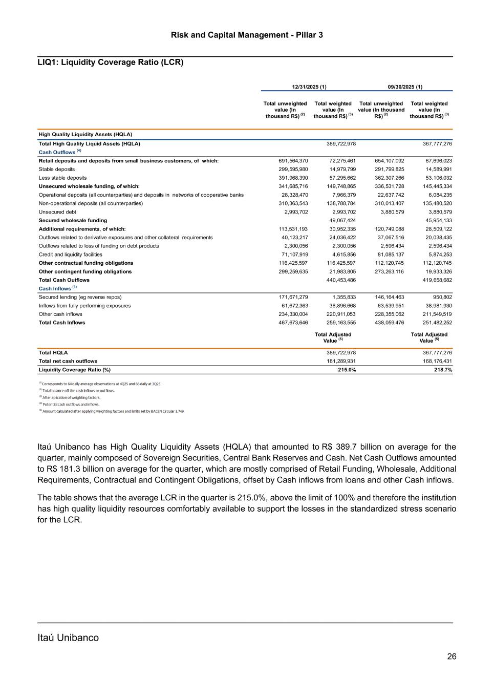 Risk and Capital Management - Pillar 3 __________________________________________________________________________________________ 26 LIQ1: Liquidity Coverage Ratio (LCR) 12/31/2025 (1) 09/30/2025 (1) Total unweighted value (In thousand R$) (2) Total weighted value (In thousand R$) (3) Total unweighted value (In thousand R$) (2) Total weighted value (In thousand R$) (3) High Quality Liquidity Assets (HQLA) Total High Quality Liquid Assets (HQLA) 389,722,978 367,777,276 Cash Outflows (4) . . Retail deposits and deposits from small business customers, of which: 691,564,370 72,275,461 654,107,092 67,696,023 Stable deposits 299,595,980 14,979,799 291,799,825 14,589,991 Less stable deposits 391,968,390 57,295,662 362,307,266 53,106,032 Unsecured wholesale funding, of which: 341,685,716 149,748,865 336,531,728 145,445,334 Operational deposits (all counterparties) and deposits in networks of cooperative banks 28,328,470 7,966,379 22,637,742 6,084,235 Non-operational deposits (all counterparties) 310,363,543 138,788,784 310,013,407 135,480,520 Unsecured debt 2,993,702 2,993,702 3,880,579 3,880,579 Secured wholesale funding 49,067,424 45,954,133 Additional requirements, of which: 113,531,193 30,952,335 120,749,088 28,509,122 Outflows related to derivative exposures and other collateral requirements 40,123,217 24,036,422 37,067,516 20,038,435 Outflows related to loss of funding on debt products 2,300,056 2,300,056 2,596,434 2,596,434 Credit and liquidity facilities 71,107,919 4,615,856 81,085,137 5,874,253 Other contractual funding obligations 116,425,597 116,425,597 112,120,745 112,120,745 Other contingent funding obligations 299,259,635 21,983,805 273,263,116 19,933,326 Total Cash Outflows 440,453,486 419,658,682 Cash Inflows (4) Secured lending (eg reverse repos) 171,671,279 1,355,833 146,164,463 950,802 Inflows from fully performing exposures 61,672,363 36,896,668 63,539,951 38,981,930 Other cash inflows 234,330,004 220,911,053 228,355,062 211,549,519 Total Cash Inflows 467,673,646 259,163,555 438,059,476 251,482,252 Total Adjusted Value (5) Total Adjusted Value (5) Total HQLA 389,722,978 367,777,276 Total net cash outflows 181,289,931 168,176,431 Liquidity Coverage Ratio (%) 215.0% 218.7% Itaú Unibanco has High Quality Liquidity Assets (HQLA) that amounted to R$ 389.7 billion on average for the quarter, mainly composed of Sovereign Securities, Central Bank Reserves and Cash. Net Cash Outflows amounted to R$ 181.3 billion on average for the quarter, which are mostly comprised of Retail Funding, Wholesale, Additional Requirements, Contractual and Contingent Obligations, offset by Cash inflows from loans and other Cash inflows. The table shows that the average LCR in the quarter is 215.0%, above the limit of 100% and therefore the institution has high quality liquidity resources comfortably available to support the losses in the standardized stress scenario for the LCR. __________________________________________________________________________________________ Itaú Unibanco