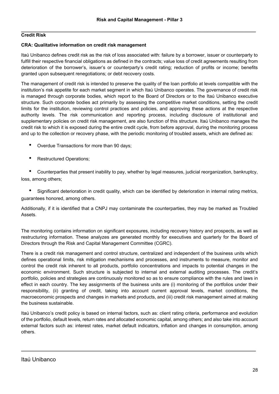 Risk and Capital Management - Pillar 3 __________________________________________________________________________________________ __________________________________________________________________________________________ Itaú Unibanco 28 Credit Risk CRA: Qualitative information on credit risk management Itaú Unibanco defines credit risk as the risk of loss associated with: failure by a borrower, issuer or counterparty to fulfill their respective financial obligations as defined in the contracts; value loss of credit agreements resulting from deterioration of the borrower’s, issuer’s or counterparty’s credit rating; reduction of profits or income; benefits granted upon subsequent renegotiations; or debt recovery costs. The management of credit risk is intended to preserve the quality of the loan portfolio at levels compatible with the institution’s risk appetite for each market segment in which Itaú Unibanco operates. The governance of credit risk is managed through corporate bodies, which report to the Board of Directors or to the Itaú Unibanco executive structure. Such corporate bodies act primarily by assessing the competitive market conditions, setting the credit limits for the institution, reviewing control practices and policies, and approving these actions at the respective authority levels. The risk communication and reporting process, including disclosure of institutional and supplementary policies on credit risk management, are also function of this structure. Itaú Unibanco manages the credit risk to which it is exposed during the entire credit cycle, from before approval, during the monitoring process and up to the collection or recovery phase, with the periodic monitoring of troubled assets, which are defined as: • Overdue Transactions for more than 90 days; • Restructured Operations; • Counterparties that present inability to pay, whether by legal measures, judicial reorganization, bankruptcy, loss, among others; • Significant deterioration in credit quality, which can be identified by deterioration in internal rating metrics, guarantees honored, among others. Additionally, if it is identified that a CNPJ may contaminate the counterparties, they may be marked as Troubled Assets. The monitoring contains information on significant exposures, including recovery history and prospects, as well as restructuring information. These analyzes are generated monthly for executives and quarterly for the Board of Directors through the Risk and Capital Management Committee (CGRC). There is a credit risk management and control structure, centralized and independent of the business units which defines operational limits, risk mitigation mechanisms and processes, and instruments to measure, monitor and control the credit risk inherent to all products, portfolio concentrations and impacts to potential changes in the economic environment. Such structure is subjected to internal and external auditing processes. The credit’s portfolio, policies and strategies are continuously monitored so as to ensure compliance with the rules and laws in effect in each country. The key assignments of the business units are (i) monitoring of the portfolios under their responsibility, (ii) granting of credit, taking into account current approval levels, market conditions, the macroeconomic prospects and changes in markets and products, and (iii) credit risk management aimed at making the business sustainable. Itaú Unibanco’s credit policy is based on internal factors, such as: client rating criteria, performance and evolution of the portfolio, default levels, return rates and allocated economic capital, among others; and also take into account external factors such as: interest rates, market default indicators, inflation and changes in consumption, among others.