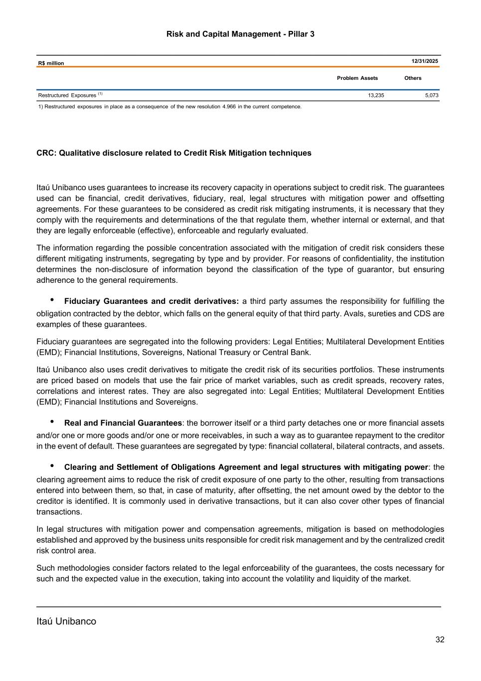 Risk and Capital Management - Pillar 3 __________________________________________________________________________________________ __________________________________________________________________________________________ Itaú Unibanco 32 R$ million 12/31/2025 Problem Assets Others Restructured Exposures (1) 13,235 5,073 1) Restructured exposures in place as a consequence of the new resolution 4.966 in the current competence. CRC: Qualitative disclosure related to Credit Risk Mitigation techniques Itaú Unibanco uses guarantees to increase its recovery capacity in operations subject to credit risk. The guarantees used can be financial, credit derivatives, fiduciary, real, legal structures with mitigation power and offsetting agreements. For these guarantees to be considered as credit risk mitigating instruments, it is necessary that they comply with the requirements and determinations of the that regulate them, whether internal or external, and that they are legally enforceable (effective), enforceable and regularly evaluated. The information regarding the possible concentration associated with the mitigation of credit risk considers these different mitigating instruments, segregating by type and by provider. For reasons of confidentiality, the institution determines the non-disclosure of information beyond the classification of the type of guarantor, but ensuring adherence to the general requirements. • Fiduciary Guarantees and credit derivatives: a third party assumes the responsibility for fulfilling the obligation contracted by the debtor, which falls on the general equity of that third party. Avals, sureties and CDS are examples of these guarantees. Fiduciary guarantees are segregated into the following providers: Legal Entities; Multilateral Development Entities (EMD); Financial Institutions, Sovereigns, National Treasury or Central Bank. Itaú Unibanco also uses credit derivatives to mitigate the credit risk of its securities portfolios. These instruments are priced based on models that use the fair price of market variables, such as credit spreads, recovery rates, correlations and interest rates. They are also segregated into: Legal Entities; Multilateral Development Entities (EMD); Financial Institutions and Sovereigns. • Real and Financial Guarantees: the borrower itself or a third party detaches one or more financial assets and/or one or more goods and/or one or more receivables, in such a way as to guarantee repayment to the creditor in the event of default. These guarantees are segregated by type: financial collateral, bilateral contracts, and assets. • Clearing and Settlement of Obligations Agreement and legal structures with mitigating power: the clearing agreement aims to reduce the risk of credit exposure of one party to the other, resulting from transactions entered into between them, so that, in case of maturity, after offsetting, the net amount owed by the debtor to the creditor is identified. It is commonly used in derivative transactions, but it can also cover other types of financial transactions. In legal structures with mitigation power and compensation agreements, mitigation is based on methodologies established and approved by the business units responsible for credit risk management and by the centralized credit risk control area. Such methodologies consider factors related to the legal enforceability of the guarantees, the costs necessary for such and the expected value in the execution, taking into account the volatility and liquidity of the market.