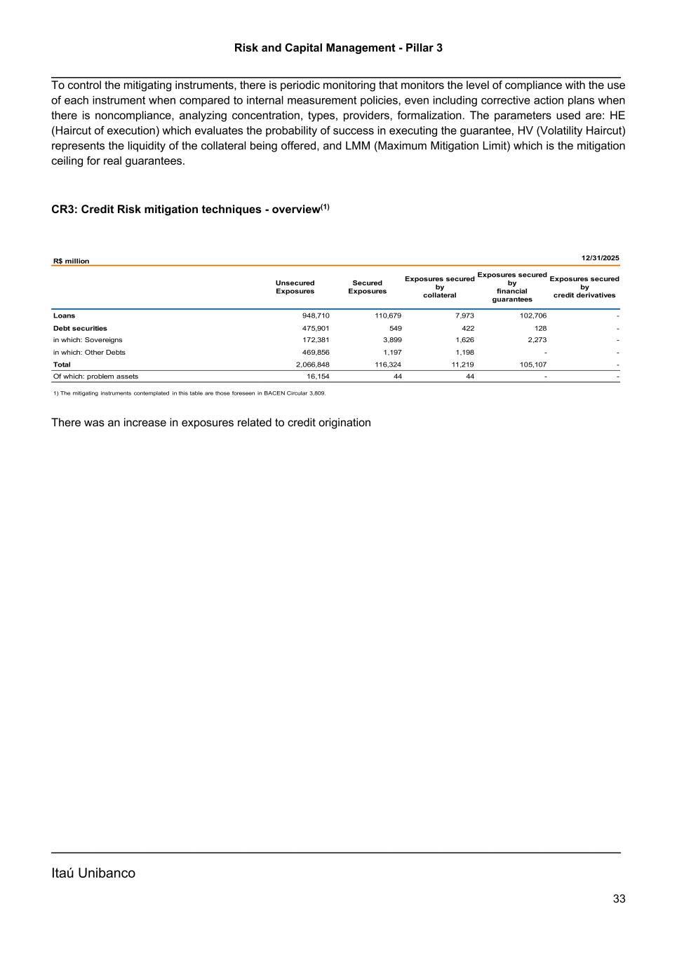 Risk and Capital Management - Pillar 3 __________________________________________________________________________________________ __________________________________________________________________________________________ Itaú Unibanco 33 To control the mitigating instruments, there is periodic monitoring that monitors the level of compliance with the use of each instrument when compared to internal measurement policies, even including corrective action plans when there is noncompliance, analyzing concentration, types, providers, formalization. The parameters used are: HE (Haircut of execution) which evaluates the probability of success in executing the guarantee, HV (Volatility Haircut) represents the liquidity of the collateral being offered, and LMM (Maximum Mitigation Limit) which is the mitigation ceiling for real guarantees. CR3: Credit Risk mitigation techniques - overview(1) R$ million 12/31/2025 Unsecured Exposures Secured Exposures Exposures secured by collateral Exposures secured by financial guarantees Exposures secured by credit derivatives Loans 948,710 110,679 7,973 102,706 - Debt securities 475,901 549 422 128 - in which: Sovereigns 172,381 3,899 1,626 2,273 - in which: Other Debts 469,856 1,197 1,198 - - Total 2,066,848 116,324 11,219 105,107 - Of which: problem assets 16,154 44 44 - - 1) The mitigating instruments contemplated in this table are those foreseen in BACEN Circular 3,809. There was an increase in exposures related to credit origination