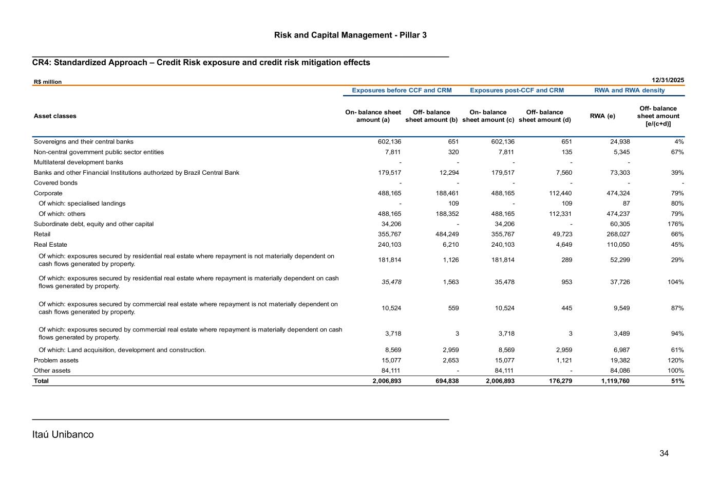 Risk and Capital Management - Pillar 3 __________________________________________________________________________________________ __________________________________________________________________________________________ Itaú Unibanco 34 CR4: Standardized Approach – Credit Risk exposure and credit risk mitigation effects R$ million 12/31/2025 Exposures before CCF and CRM Exposures post-CCF and CRM RWA and RWA density Asset classes On- balance sheet amount (a) Off- balance sheet amount (b) On- balance sheet amount (c) Off- balance sheet amount (d) RWA (e) Off- balance sheet amount [e/(c+d)] Sovereigns and their central banks 602,136 651 602,136 651 24,938 4% Non-central government public sector entities 7,811 320 7,811 135 5,345 67% Multilateral development banks - - - - - Banks and other Financial Institutions authorized by Brazil Central Bank 179,517 12,294 179,517 7,560 73,303 39% Covered bonds - - - - - - Corporate 488,165 188,461 488,165 112,440 474,324 79% Of which: specialised landings - 109 - 109 87 80% Of which: others 488,165 188,352 488,165 112,331 474,237 79% Subordinate debt, equity and other capital 34,206 - 34,206 - 60,305 176% Retail 355,767 484,249 355,767 49,723 268,027 66% Real Estate 240,103 6,210 240,103 4,649 110,050 45% Of which: exposures secured by residential real estate where repayment is not materially dependent on cash flows generated by property. 181,814 1,126 181,814 289 52,299 29% Of which: exposures secured by residential real estate where repayment is materially dependent on cash flows generated by property. 35,478 1,563 35,478 953 37,726 104% Of which: exposures secured by commercial real estate where repayment is not materially dependent on cash flows generated by property. 10,524 559 10,524 445 9,549 87% Of which: exposures secured by commercial real estate where repayment is materially dependent on cash flows generated by property. 3,718 3 3,718 3 3,489 94% Of which: Land acquisition, development and construction. 8,569 2,959 8,569 2,959 6,987 61% Problem assets 15,077 2,653 15,077 1,121 19,382 120% Other assets 84,111 - 84,111 - 84,086 100% Total 2,006,893 694,838 2,006,893 176,279 1,119,760 51%