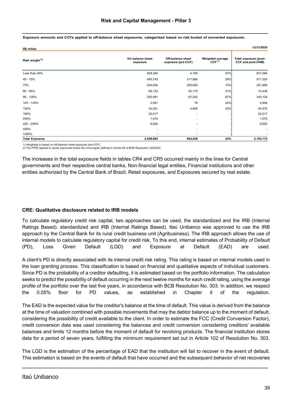 Risk and Capital Management - Pillar 3 __________________________________________________________________________________________ __________________________________________________________________________________________ Itaú Unibanco 39 Exposure amounts and CCFs applied to off-balance sheet exposures, categorised based on risk bucket of converted exposures. R$ milion 12/31/2025 Risk weight (2) On balance sheet exposure Off-balance sheet exposure (pre-CCF) Weighted average CCF (1) Total exposure (post- CCF and post-CRM) Less than 40% 828,364 4,759 57% 831,094 40 - 70% 480,743 317,660 29% 571,324 75% 254,934 260,083 10% 281,995 80 - 85% 66,133 40,170 21% 74,436 90 - 100% 300,091 67,242 67% 345,124 105 - 130% 2,591 79 22% 2,608 150% 42,021 4,845 53% 44,575 160% 20,517 - - 20,517 200% 1,579 - - 1,579 220 - 250% 9,920 - - 9,920 400% - - - - 1250% - - - - Total Exposure 2,006,893 694,838 25% 2,183,172 1) Weighting is based on off-balance sheet exposure (pre-CCF). 2) The FPRs applied to equity exposures follow the chronogram defined in Article 85 of BCB Resolution 229/2022. The increases in the total exposure fields in tables CR4 and CR5 occurred mainly in the lines for Central governments and their respective central banks, Non‑financial legal entities, Financial institutions and other entities authorized by the Central Bank of Brazil, Retail exposures, and Exposures secured by real estate. CRE: Qualitative disclosure related to IRB models To calculate regulatory credit risk capital, two approaches can be used, the standardized and the IRB (Internal Ratings Based). standardized and IRB (Internal Ratings Based). Itaú Unibanco was approved to use the IRB approach by the Central Bank for its rural credit business unit (Agribusiness). The IRB approach allows the use of internal models to calculate regulatory capital for credit risk, To this end, internal estimates of Probability of Default (PD), Loss Given Default (LGD) and Exposure at Default (EAD) are used. A client's PD is directly associated with its internal credit risk rating. This rating is based on internal models used in the loan granting process. This classification is based on financial and qualitative aspects of individual customers. Since PD is the probability of a creditor defaulting, it is estimated based on the portfolio information. The calculation seeks to predict the possibility of default occurring in the next twelve months for each credit rating, using the average profile of the portfolio over the last five years, in accordance with BCB Resolution No. 303. In addition, we respect the 0.05% floor for PD values, as established in Chapter II of the regulation. The EAD is the expected value for the creditor's balance at the time of default. This value is derived from the balance at the time of valuation combined with possible movements that may the debtor balance up to the moment of default, considering the possibility of credit available to the client. In order to estimate the FCC (Credit Conversion Factor), credit conversion data was used considering the balances and credit conversion considering creditors' available balances and limits 12 months before the moment of default for revolving products. The financial institution stores data for a period of seven years, fulfilling the minimum requirement set out in Article 102 of Resolution No. 303. The LGD is the estimation of the percentage of EAD that the institution will fail to recover in the event of default. This estimation is based on the events of default that have occurred and the subsequent behavior of net recoveries